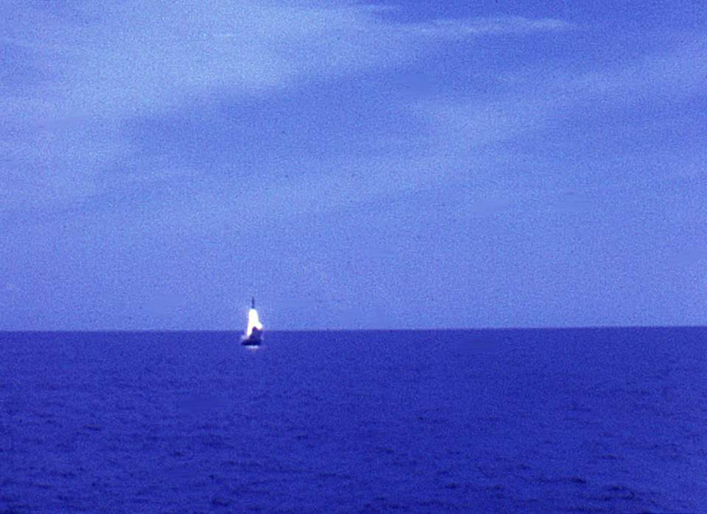 ![]() | 138k | Daniel Webster (SSBN-626) firing first of two shots of hardened A-3 missiles, August 1968. | Photo courtesy of Fred Tollison. | |