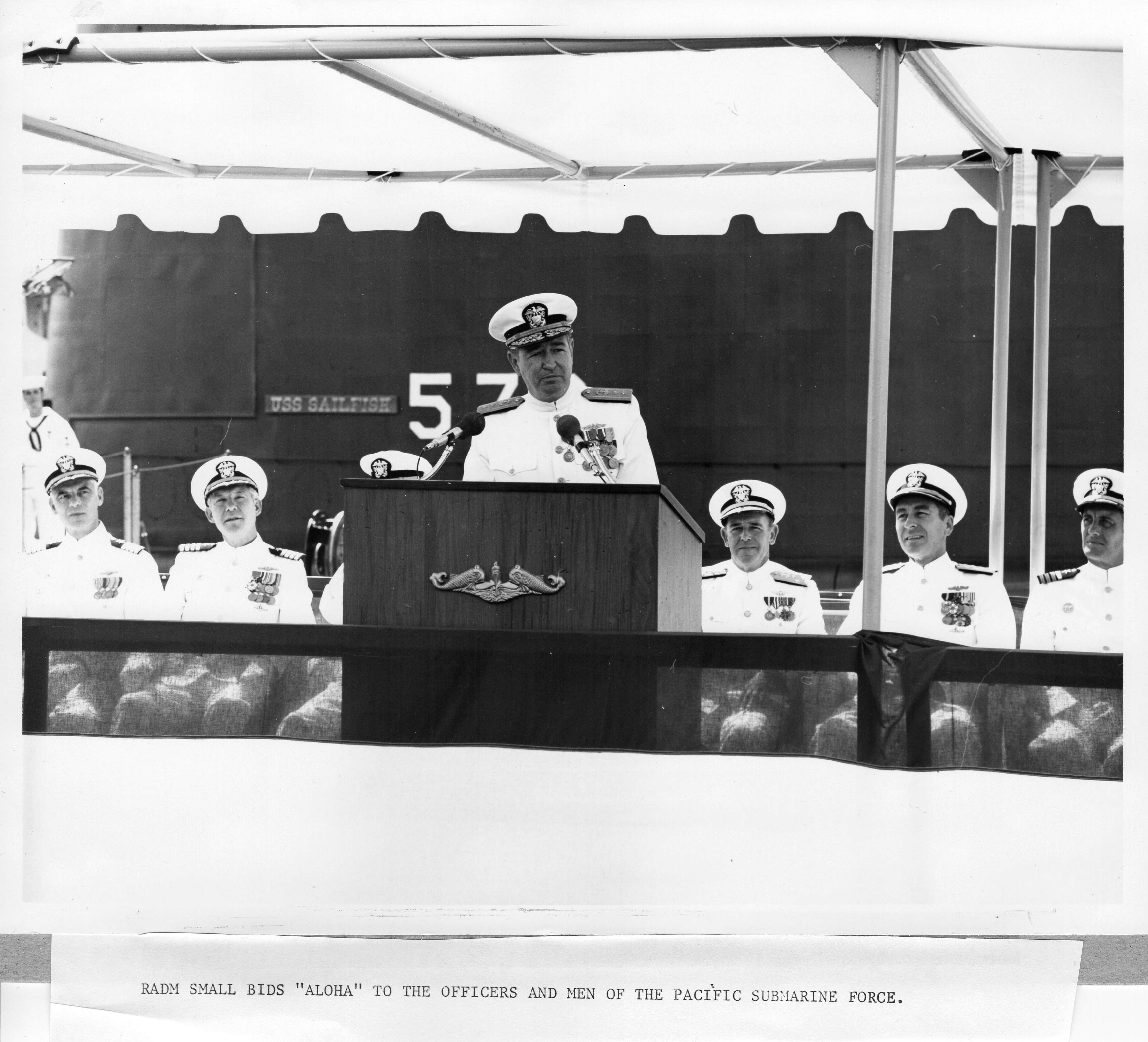 ![]() | 624k | October 1969 Bio for RADM Walter L. Small, USN. Per the bio he commanded Batfish (SS-310), Clamagore (SS-343), Van Valkenburgh (DD-656) and Sperry (AS-12). The photo is of RADM Small addressing officer and men of SUBPAC during the change of command of SUBPAC on 10/13/70 aboard the Queenfish (SSN-651). Note Sailfish (SS-572) is in the background. |