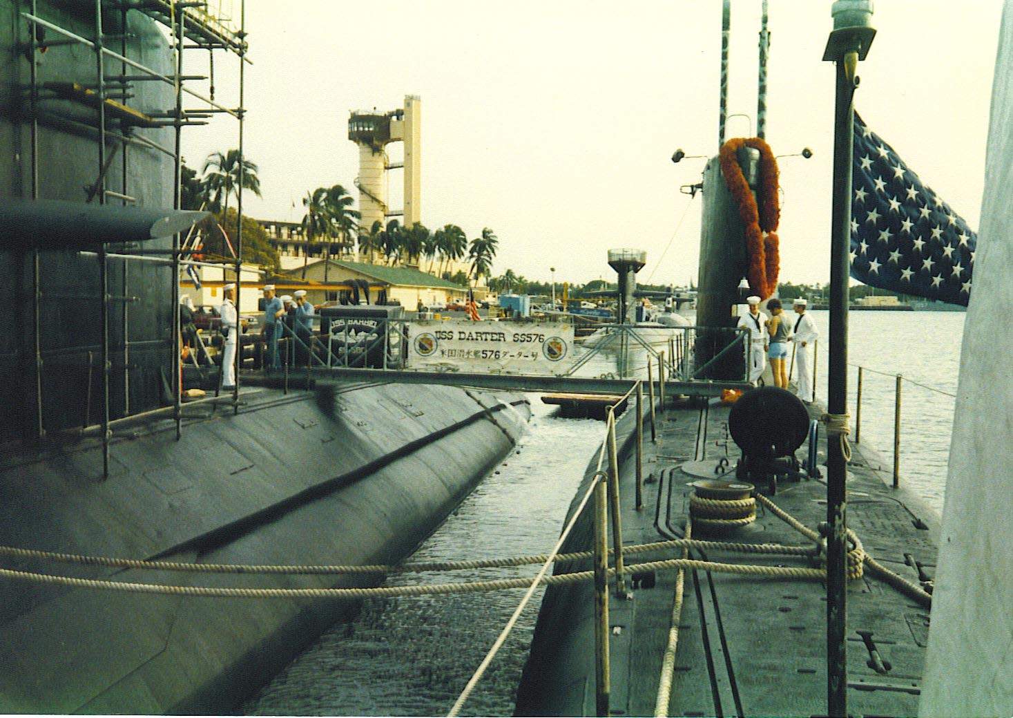 ![]() | 215k | Barbel (SS-580) and Darter (SS-576), at Sub base Pearl Harbor, June 1985. The Topside Watch on the Darter is TMSN(SS) Russ Dzielak and TMSA Jeff Buzzard. Directly astern of the duo is the Queenfish (SSN-651). | Photo by David Johnston (USN, retired) . | |