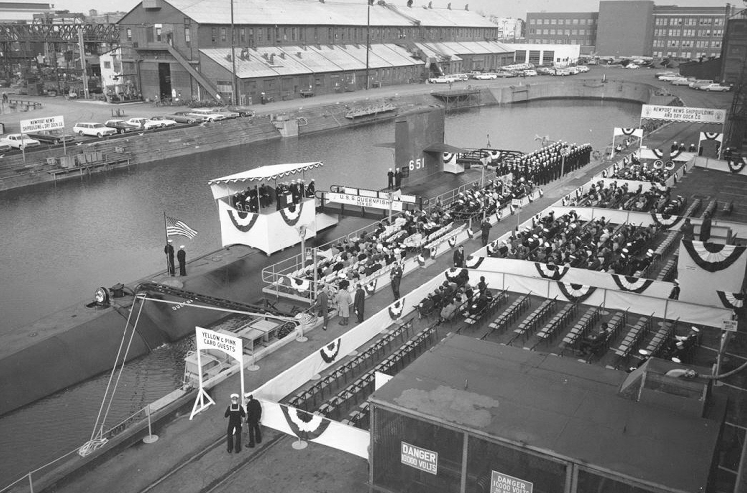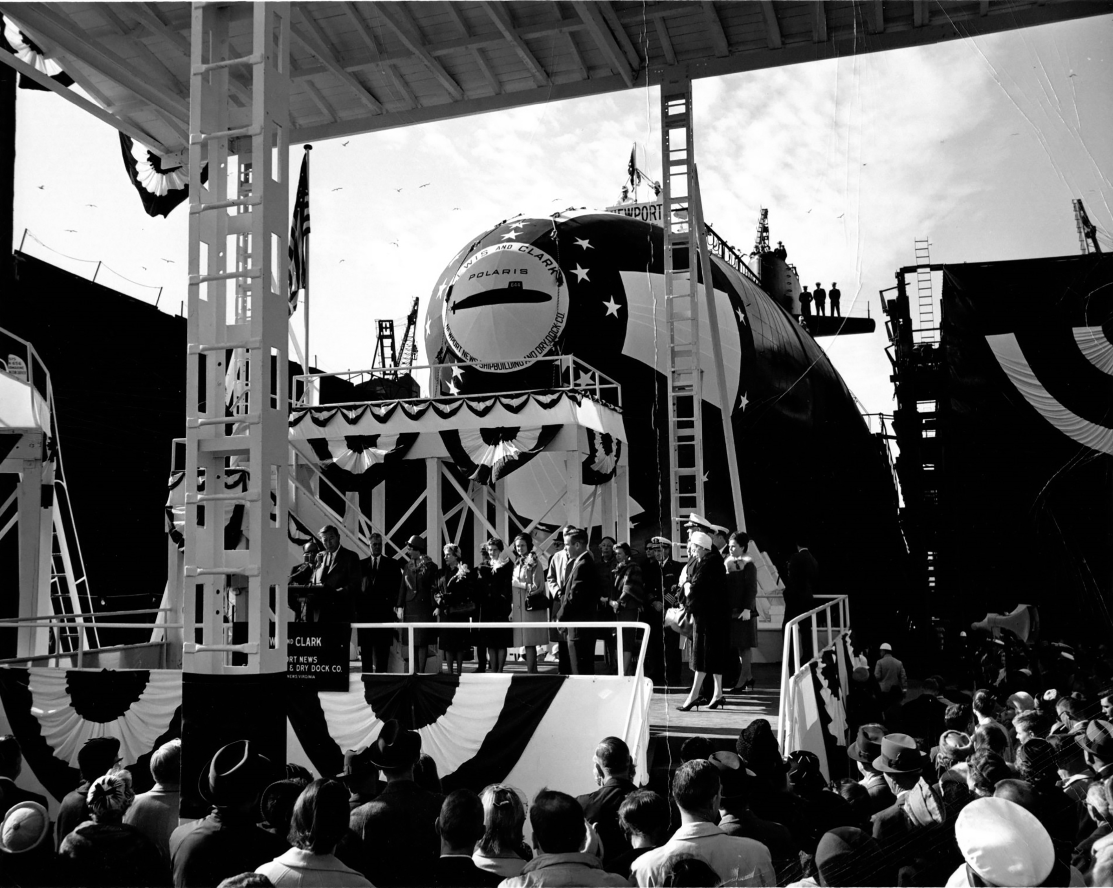 1.43k | Lewis & Clark (SSBN-644) launching ceremony on 21 November 1964. Rep. Thomas N. Downing of Virginia is at the podium. Under construction to the ship's left is the Queenfish (SSN-651). | Photo courtesy of Dale Hargrave. | |