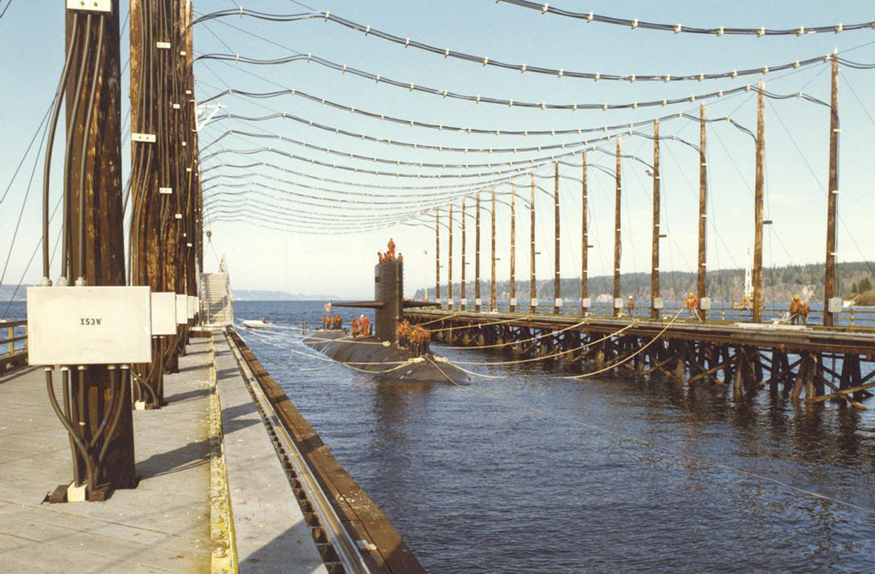 ![]() | 746k | The Queenfish (SSN-651) is helped along as she approaches the Magnetic Silencing Facility at Naval Base Kitsap Bangor for her deperming treatment circa mid 1970's. The deperming process reduces a ships electromagnetic signature as she travels through the water. | USN photos courtesy of Scott Koen & ussnewyork.com. | |