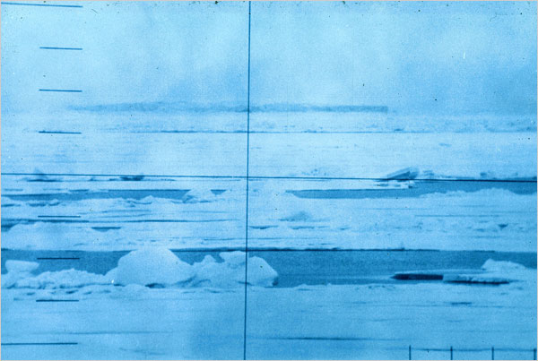 ![]() | 55k | Thinning ice. This view through the periscope on 3 August was typical: ice and water. The first half of the Queenfish's (SSN-651) journey retraced most of the path that the Nautilus (SSN-571) took in its historic 1958 trip to the North Pole, the first vessel to travel there under the ice. Alfred S. McLaren, the Queenfish's (SSN-651) commander, wanted to compare the ice conditions of 1970 with those 18 years earlier. The ice had, on average, thinned 28 inches between those two voyages. | USN photo & text courtesy of NY Times from the article: "Queenfish: A Cold War Tale" 18 March 2008, by William J. Broad. | |