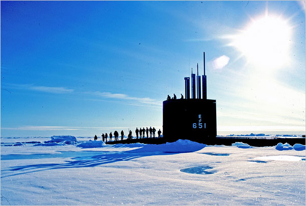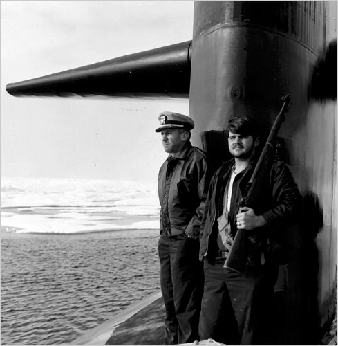 ![]() | 42k | Polar bear watch. Commander McLaren and a crew member stand on watch for polar bears. Later in the voyage, the Queenfish (SSN-651) had a memorable encounter with a polar bear family. | USN photo & text courtesy of NY Times from the article: "Queenfish: A Cold War Tale" 18 March 2008, by William J. Broad. | |