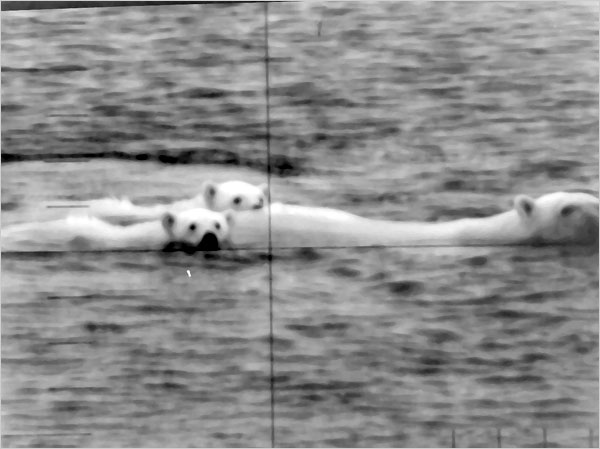 ![]() | 41k | Bear attack. The polar bears jumped into the water and swam directly at the periscope. "The cross hairs are on her nose," Dr. McLaren recalled in 2002. "And I'm thinking, 'How am I going to explain teeth marks on my periscope when I get back to port.?' " The bear sniffed at the periscope and turned away, with the cubs following. | USN photo & text courtesy of NY Times from the article: "Queenfish: A Cold War Tale" 18 March 2008, by William J. Broad. | |