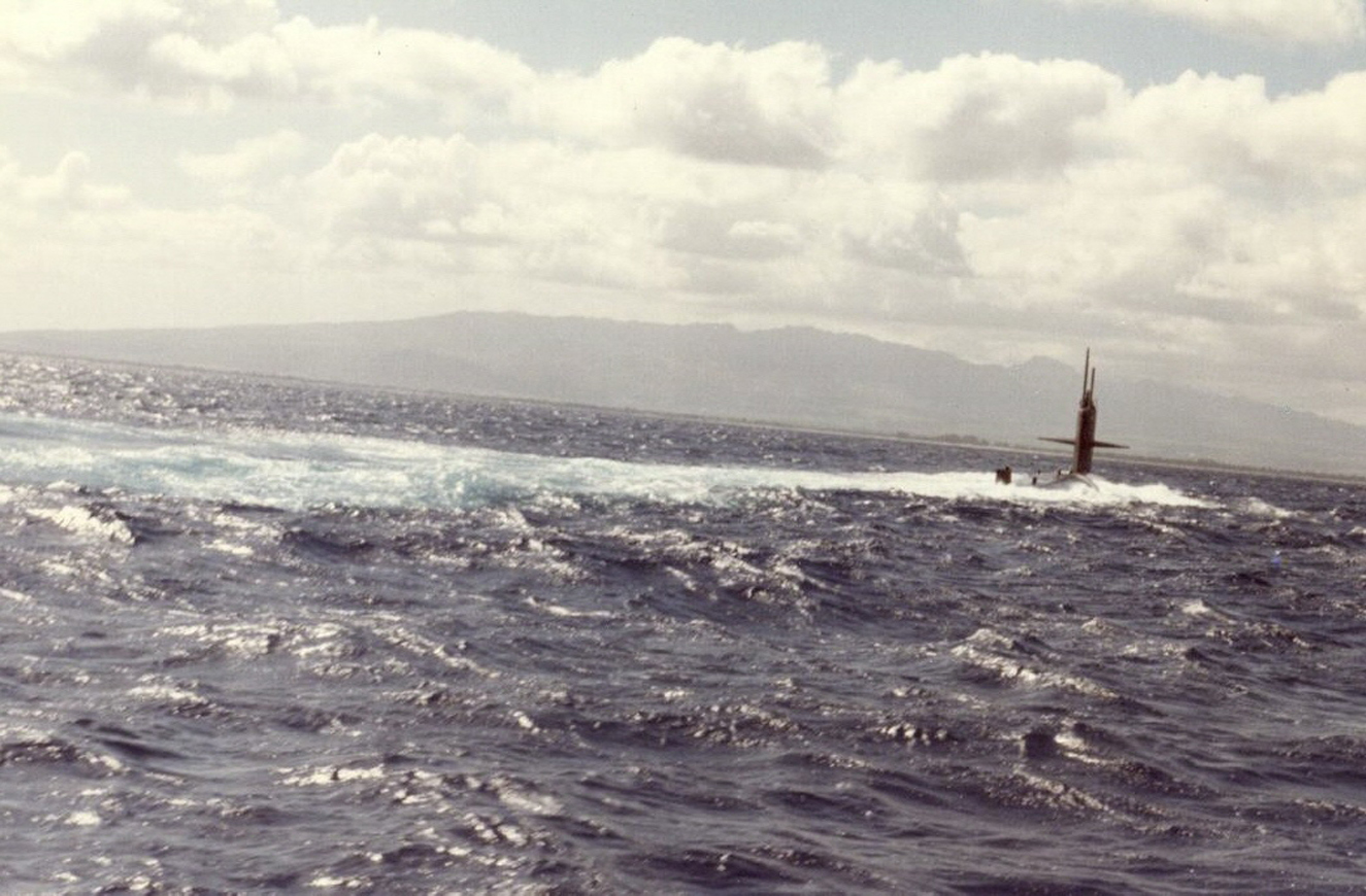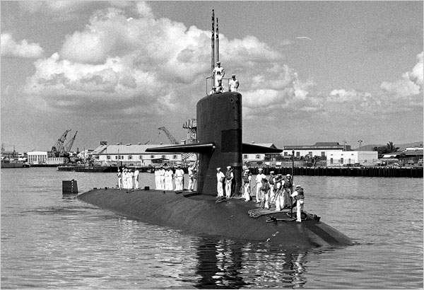 ![]() | 68k | Mission accomplished. The Queenfish (SSN-651) passed south through the Bering Strait on 30 August after traveling 3,100 nautical miles along the Siberian coast. It arrived at Pearl Harbor, its home port, on 11 September 1970. (Note that there is no number on its side, unlike the photograph at the North Pole.) | USN photo & text courtesy of NY Times from the article: "Queenfish: A Cold War Tale" 18 March 2008, by William J. Broad. | |