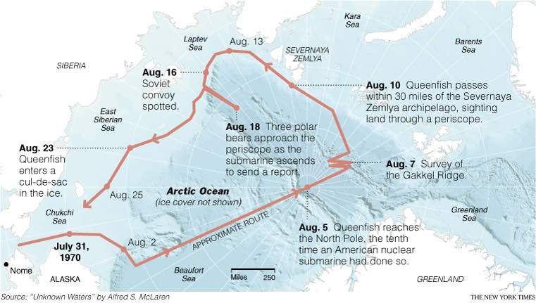![]() | 49k | The Path of the Queenfish (SSN-651). | USN photo & text courtesy of NY Times from the article: "Queenfish: A Cold War Tale" 18 March 2008, by William J. Broad courtesy of the book "Unknown Waters," by Dr. Alfred S. McLaren (USN ret). | |