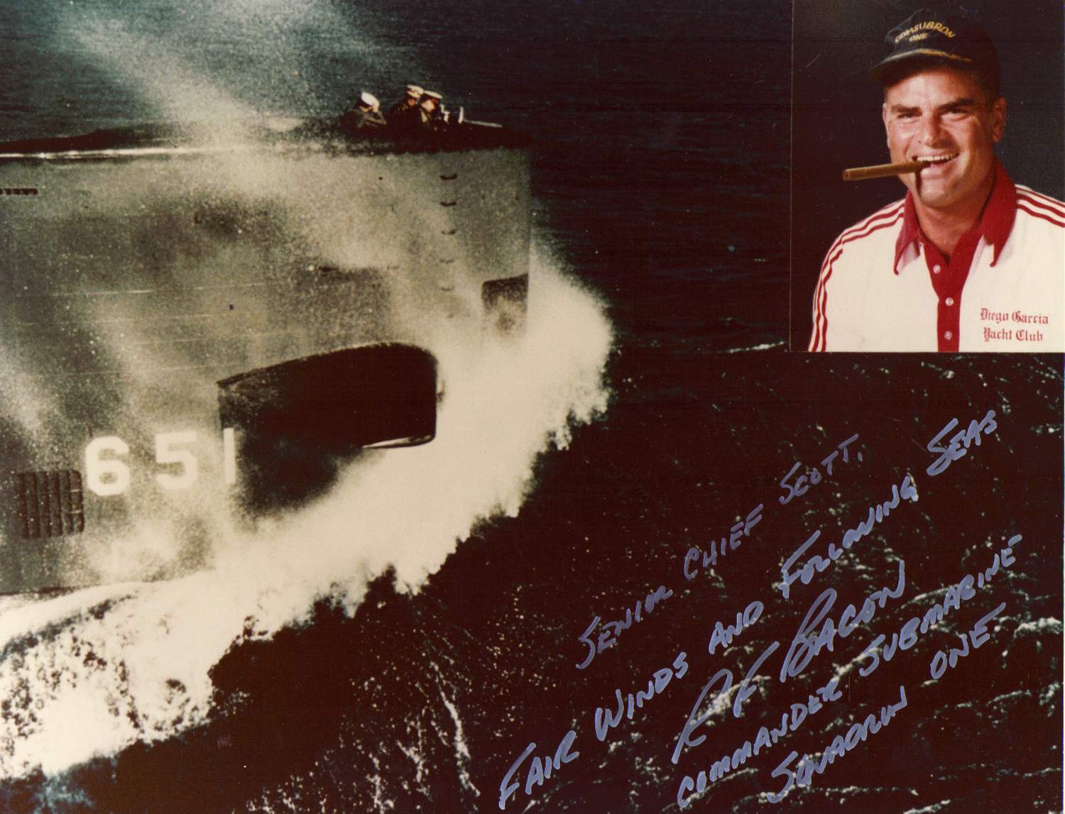 ![]() | 168k | Cmdr Bacon of the Diego Garcia Yacht club member Queenfish (SSN-651). | USN photo # NPC KN-15094, courtesy of Scott Koen & ussnewyork.com. | |