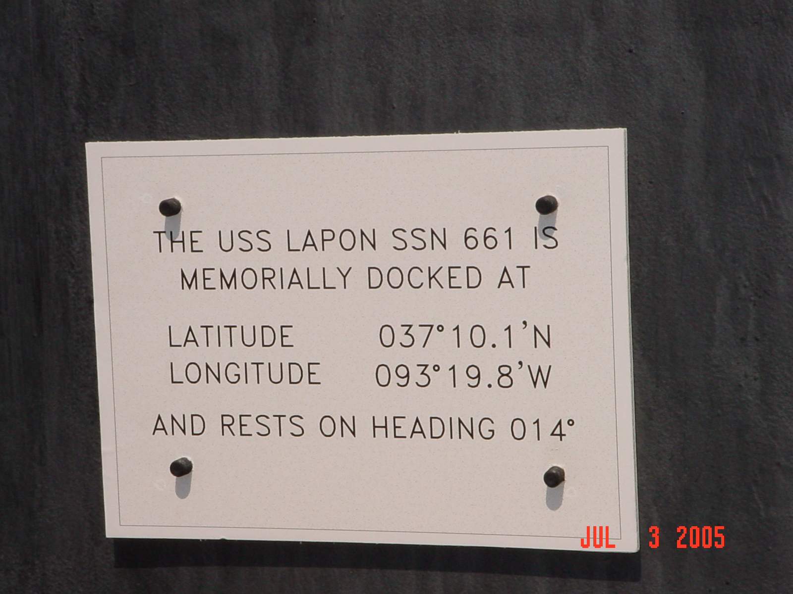 ![]() | 129k | Lapon's (SSN-661) Plaque showing her final location: The American Legion, Post 639 located in Springfield, MO. | Courtesy of Dale E Loney,(DSCC). | |