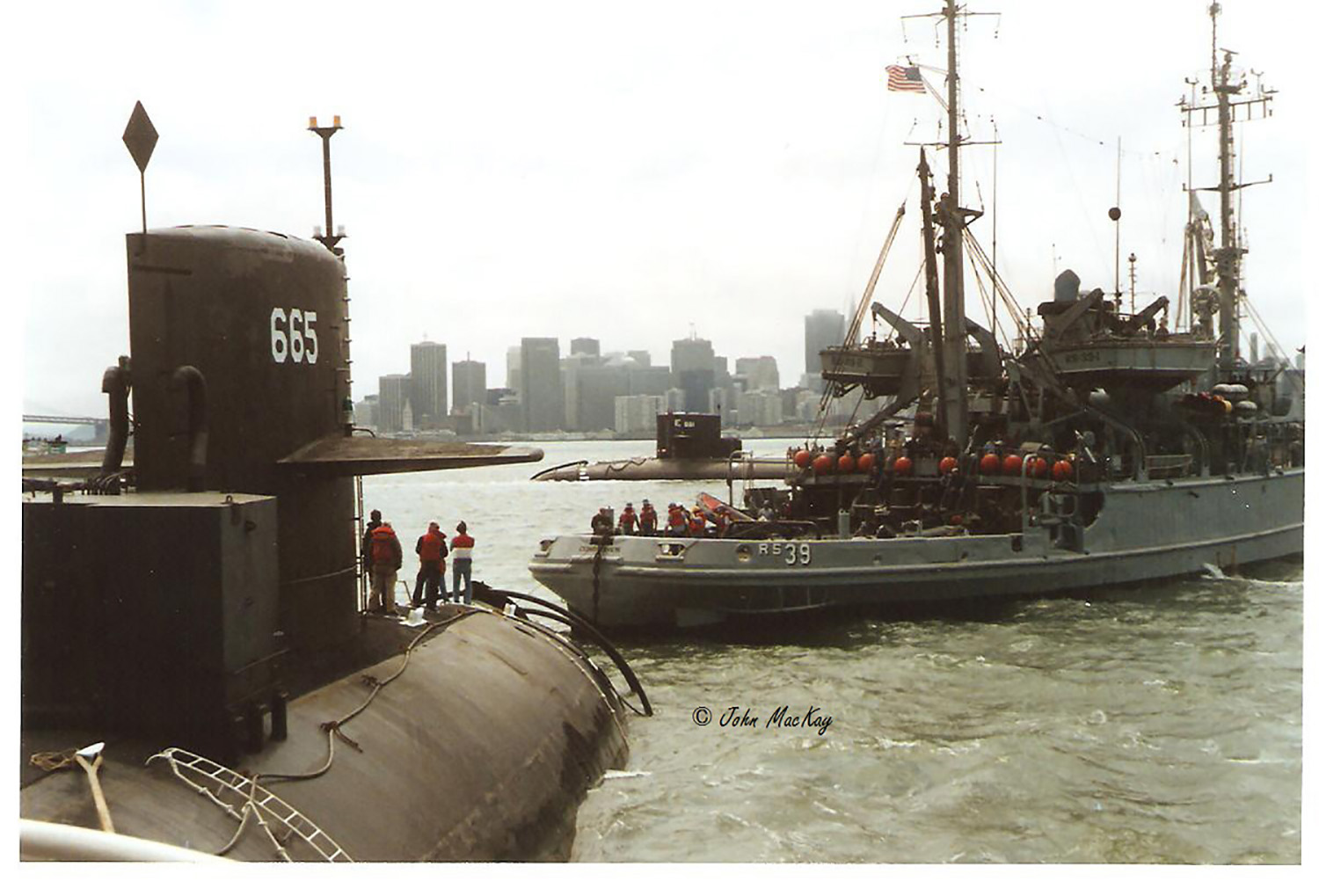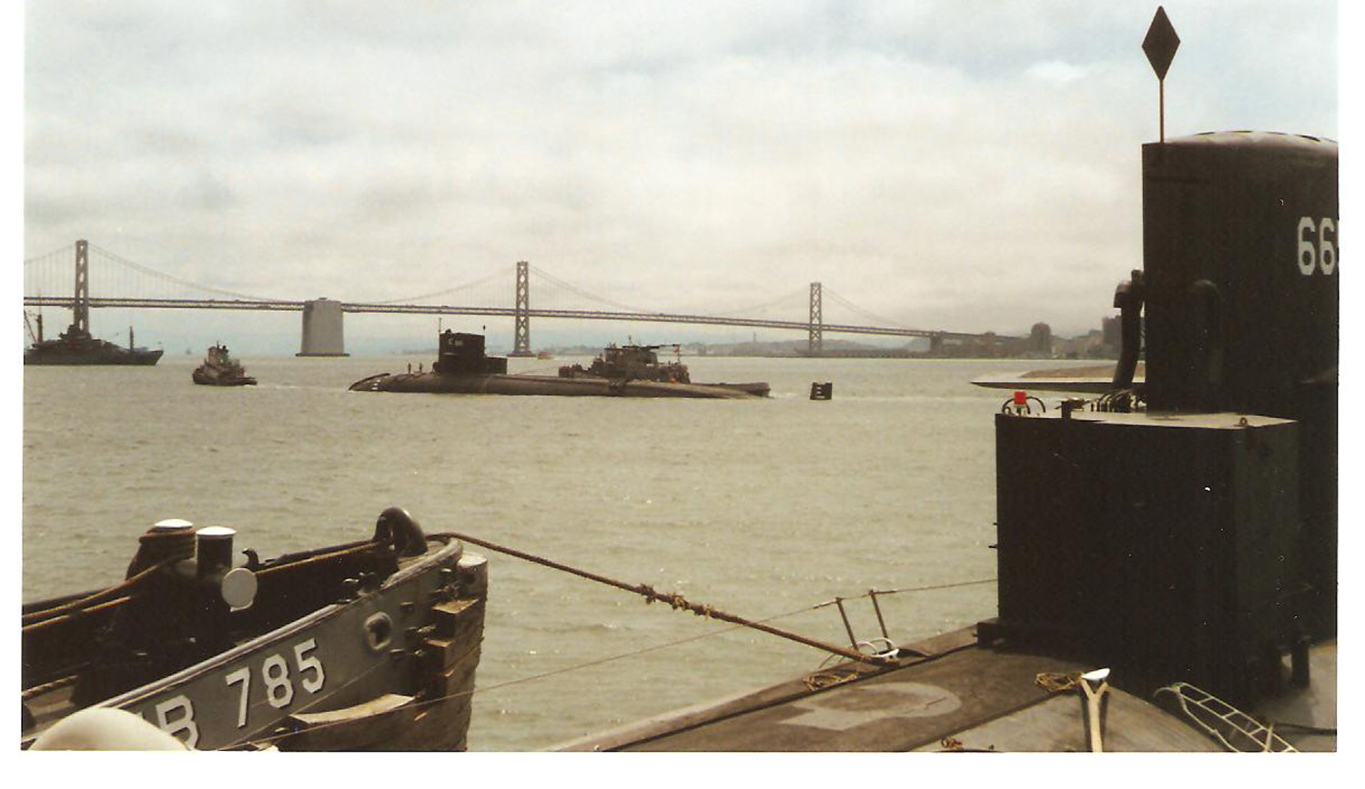 ![]() | 82k | Twin Towing: Between 8/17 and 8/21 Guitarro (SSN-665) & Lapon (SSN-661) being towed from Mare Island, where they had been decommissioned and defueled, to Puget Sound Naval Shipyard (PSNS) in Bremerton, Washington. Guitarro next to rescue and salvage vessel Conserver, (ARS-39), with Lapon in the background. At this point, the harbor tugs were transferring Guitarro and Lapon to ocean-going tugs. Guitarro and Lapon were decommissioned at the same time and towed to PSNS at the same time. | Photo i.d. via Terry Munger. Photo courtesy of John MacKay. |