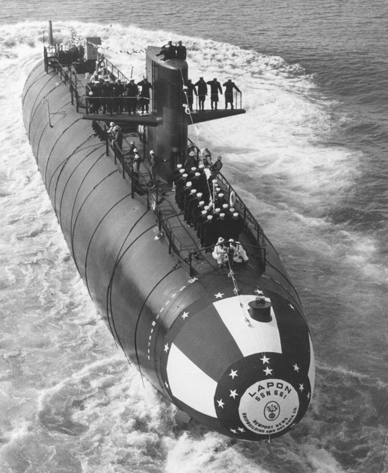 ![]() | 615k | Lapon (SSN-661) looms large during her trials in December 1967. | USN photo # NPC K-42261 courtesy of Scott Koen & ussnewyork.com. | |