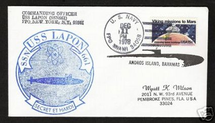 ![]() | 28k | Commemorative postal cover with Lapon's (SSN-661) patch on the occasion of the boat's visit to the Bahamas on 11 December 1978. | Courtesy of Jack Treutle (of blessed memory). | |