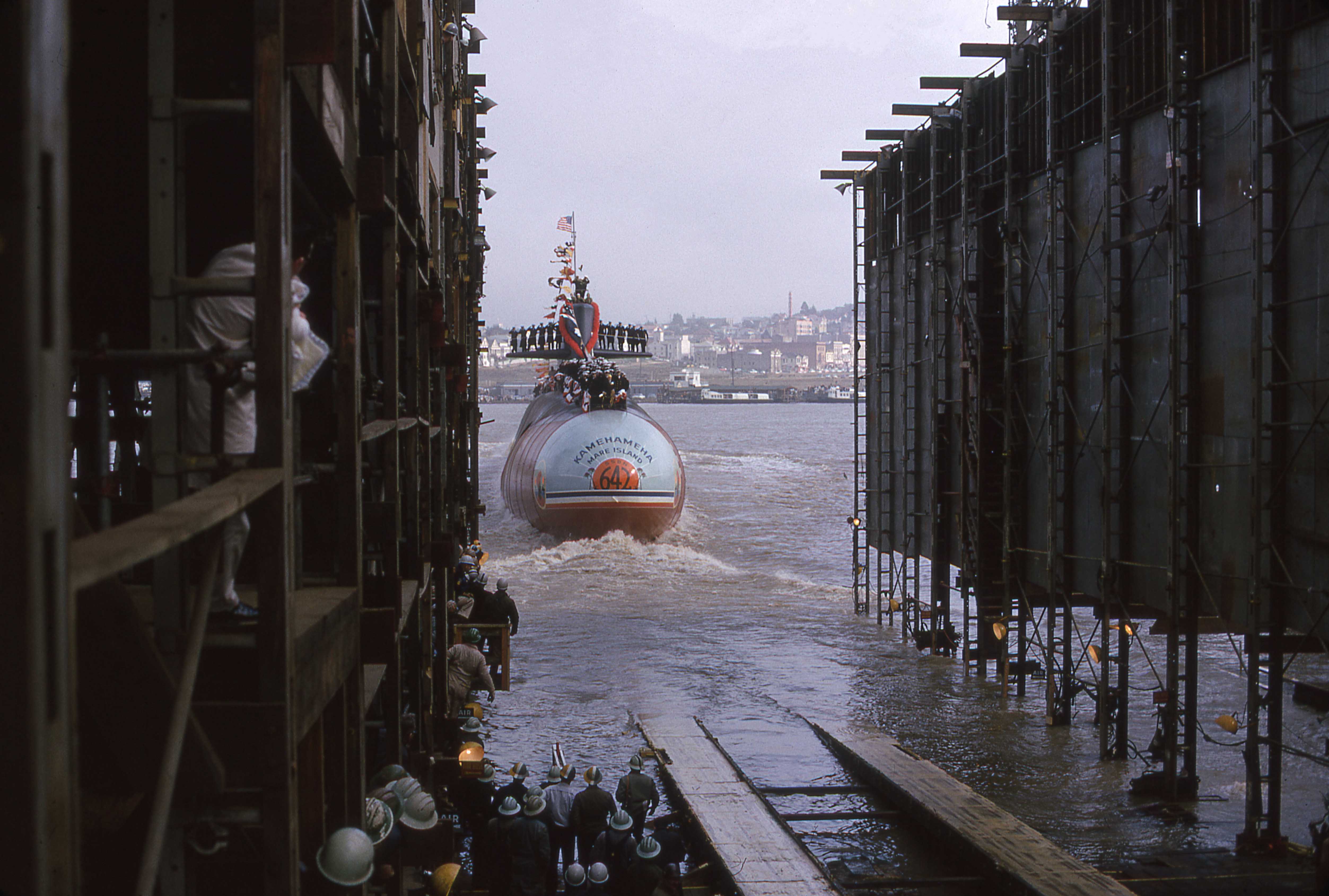 ![]() | 1.40k | Mrs. Samuel Wilder King (Ship's Sponsor) is prepared to christen the Kamehameha (SSBN-642) at Mare Island Naval Shipyard on 16 January 1965. Kamehameha was the yard's sixth Polaris and 11th nuclear-powered submarine. The hull of the Gurnard (SSN-662) being constructed on the ways to the right. | USN photo # MSA 66282-1-65,courtesy of Darryl L. Baker. | |