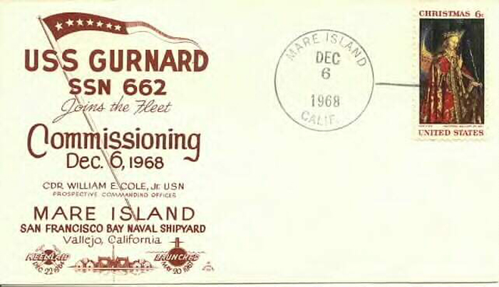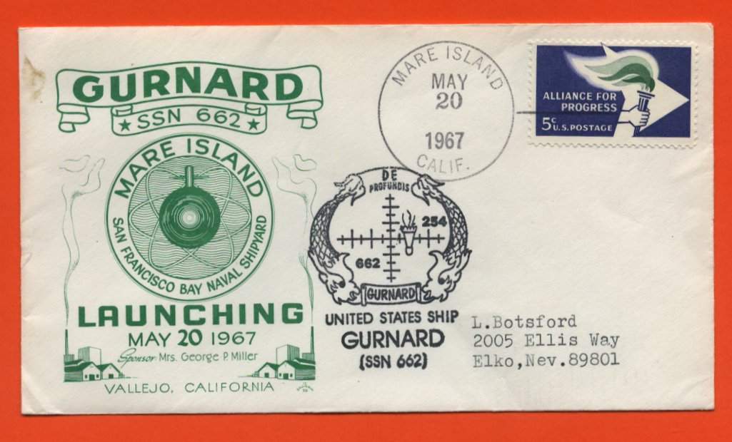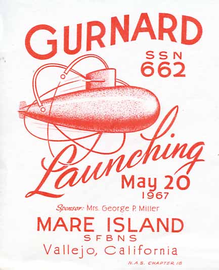 >![]() | 17k | Commemorative post mark on the occasion of the launching the Gurnard (SSN-662) at Mare Island on 20 May 1967. | Courtesy of Jack Treutle (of blessed memory). | |