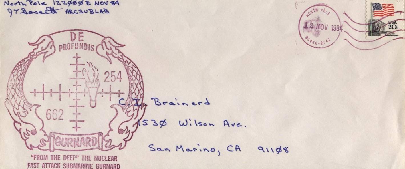 ![]() | 70k | Commemorative postal cover issued on the occasion of the Polar visit of the Gurnard (SSN-662), 12 November 1984. | Courtesy of Jack Treutle (of blessed memory). | |