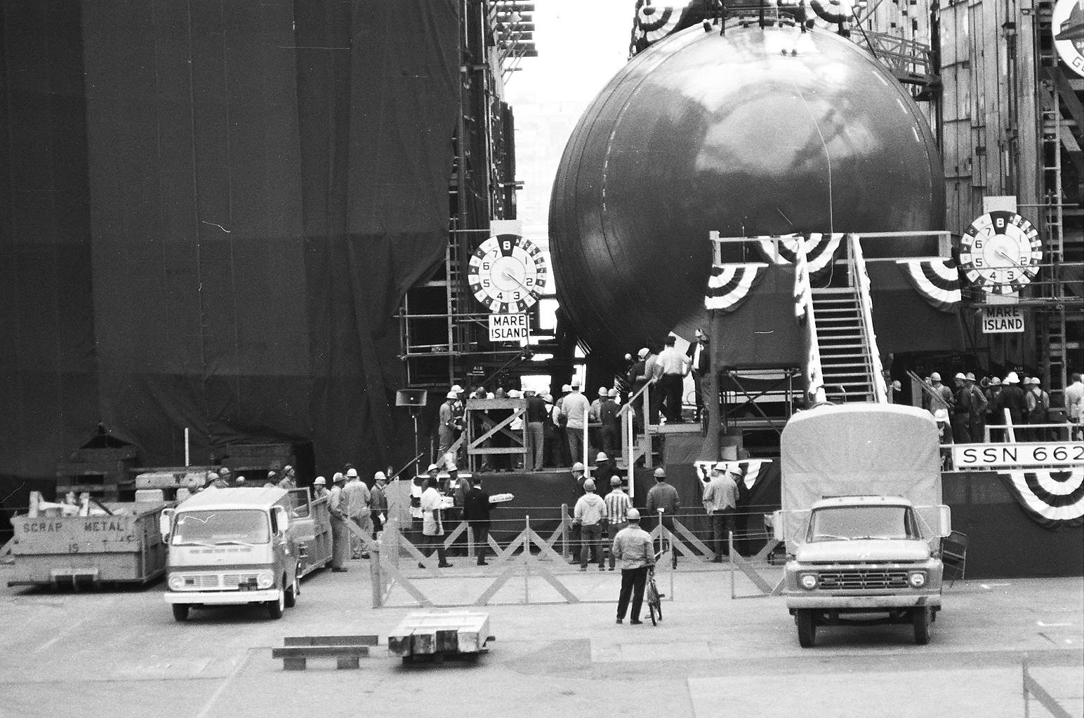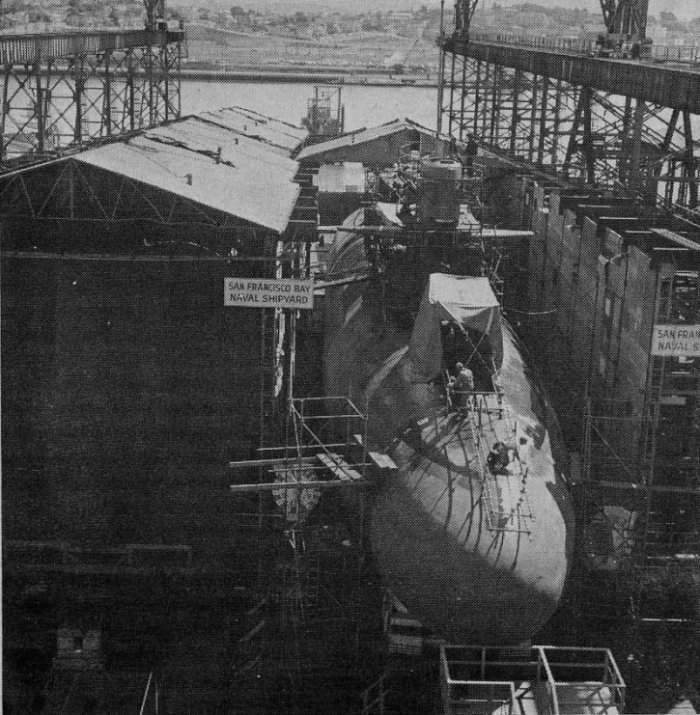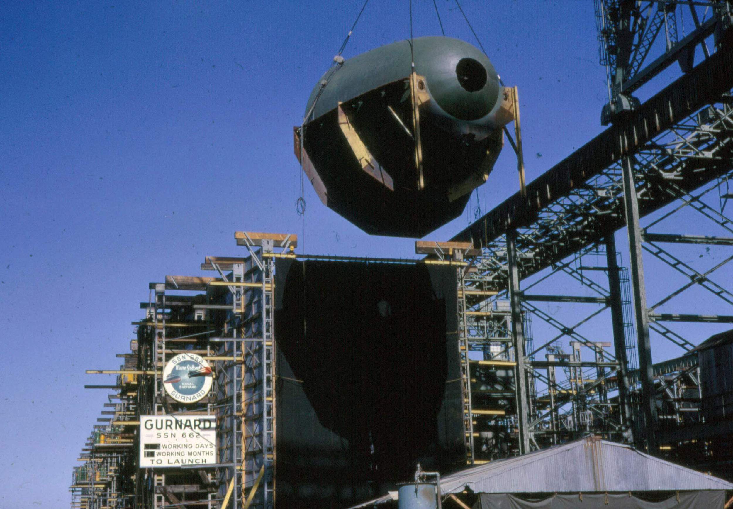 ![]() | 2.40k | Sonar dome for the Gurnard (SSN-662) is about in place on the building ways at Mare Island on 16 May 1966. | USN photo courtesy of Darryl L. Baker. | |