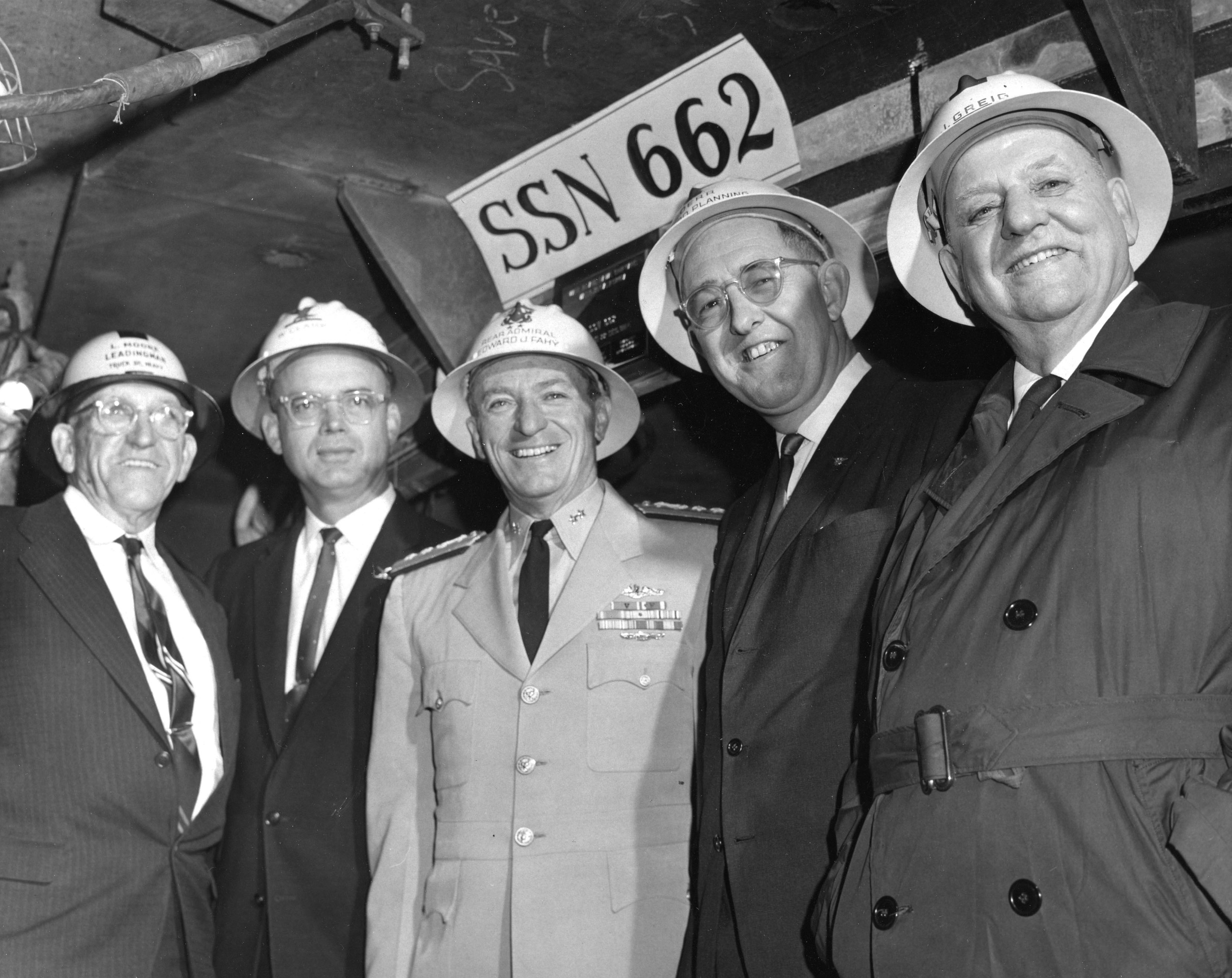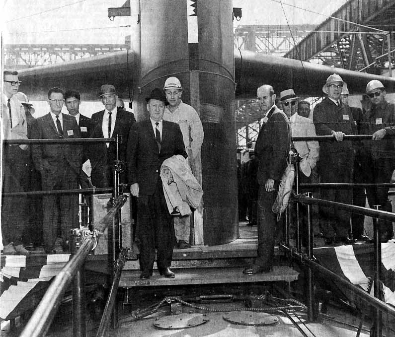 ![]() | 740k | Photo from the 22 December 1964 issue of Vallejo's paper The News Evening Chronicle. Caption: Honorary keel layers pose with RADM Edward J. Fahy, USN, Mare Island Navy Yard Commander, after keel laying ceremonies for the fast attack submarine (SSN-662) (She wasn't named at the time) early today. Pictured from left to right, are Louis K. Moore, Leadingman Truck Driver; Wallace W. Clark, Master of the Machine Group; RADM Edward J. Fahy, USN; Francis W. Derr, Administrative Division Head, and Fire Chief James Greig. | USN photo # 66043-12-64 TH courtesy of Darryl L. Baker. < | |