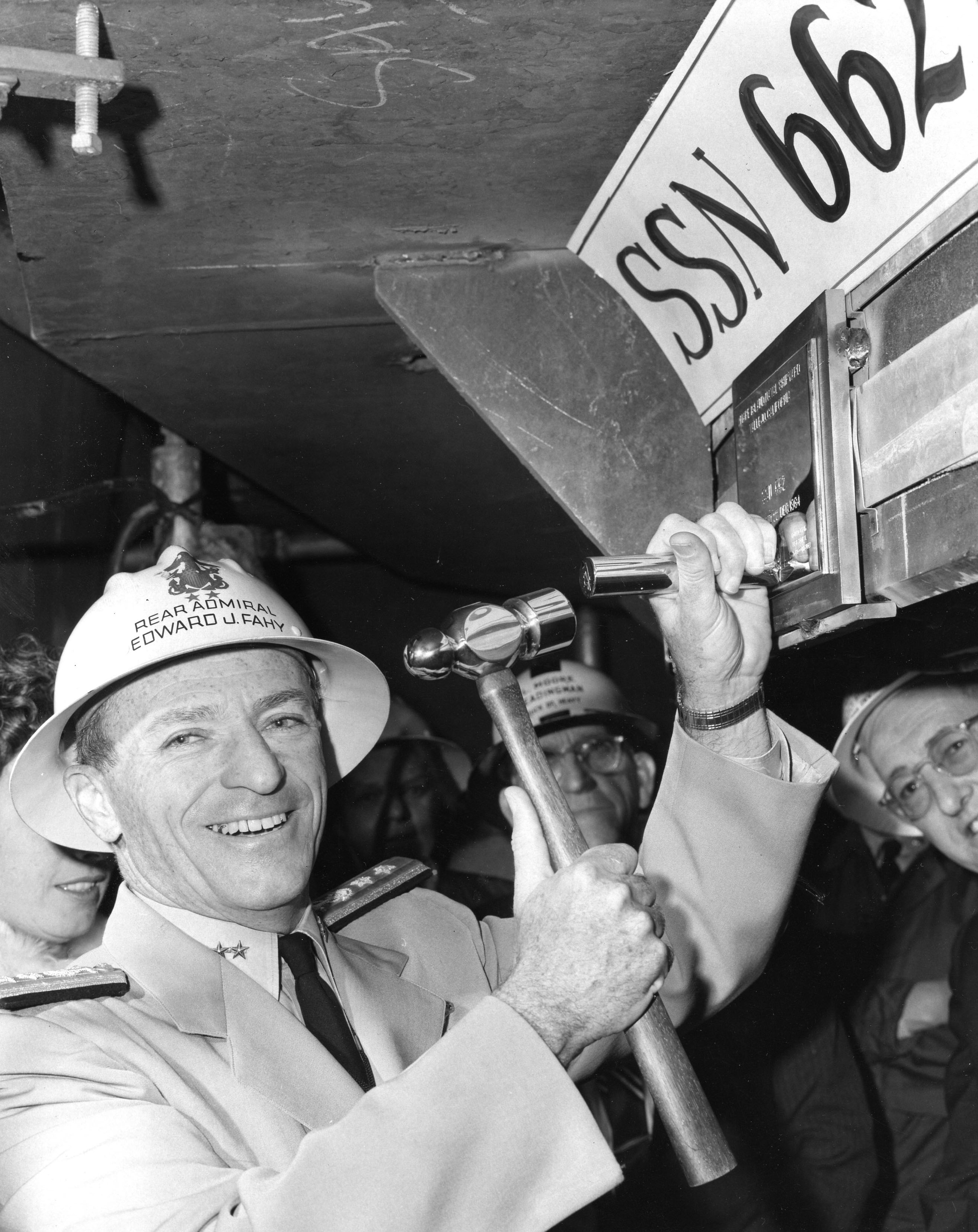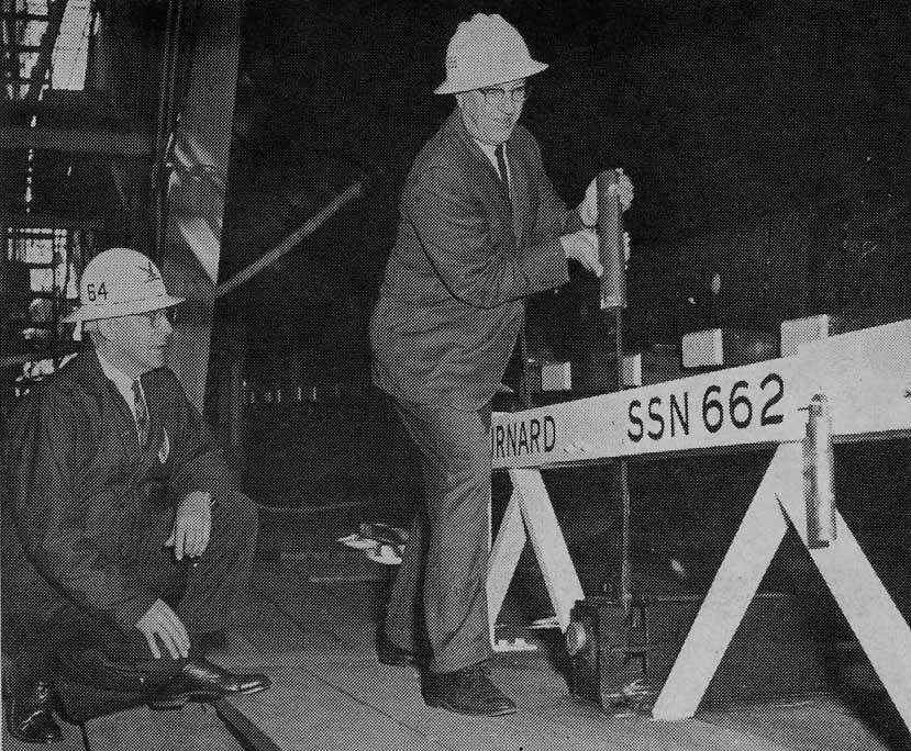 ![]() | 854k | Photo from the 22 December 1964 issue of Vallejo's paper, The News Evening Chronicle. Caption: RADM Edward J. Fahy, USN, Mare Island Navy Yard Commander, stamps his initials on the keel plate of the (SSN-662), as the first hull section of the fast attack submarine was placed on the building ways today. The unnamed submarine will be the shipyard's 507th ship and 13th nuclear powered submarine. | USN photo # 66641-12-64 TH courtesy of Darryl L. Baker. < | |
