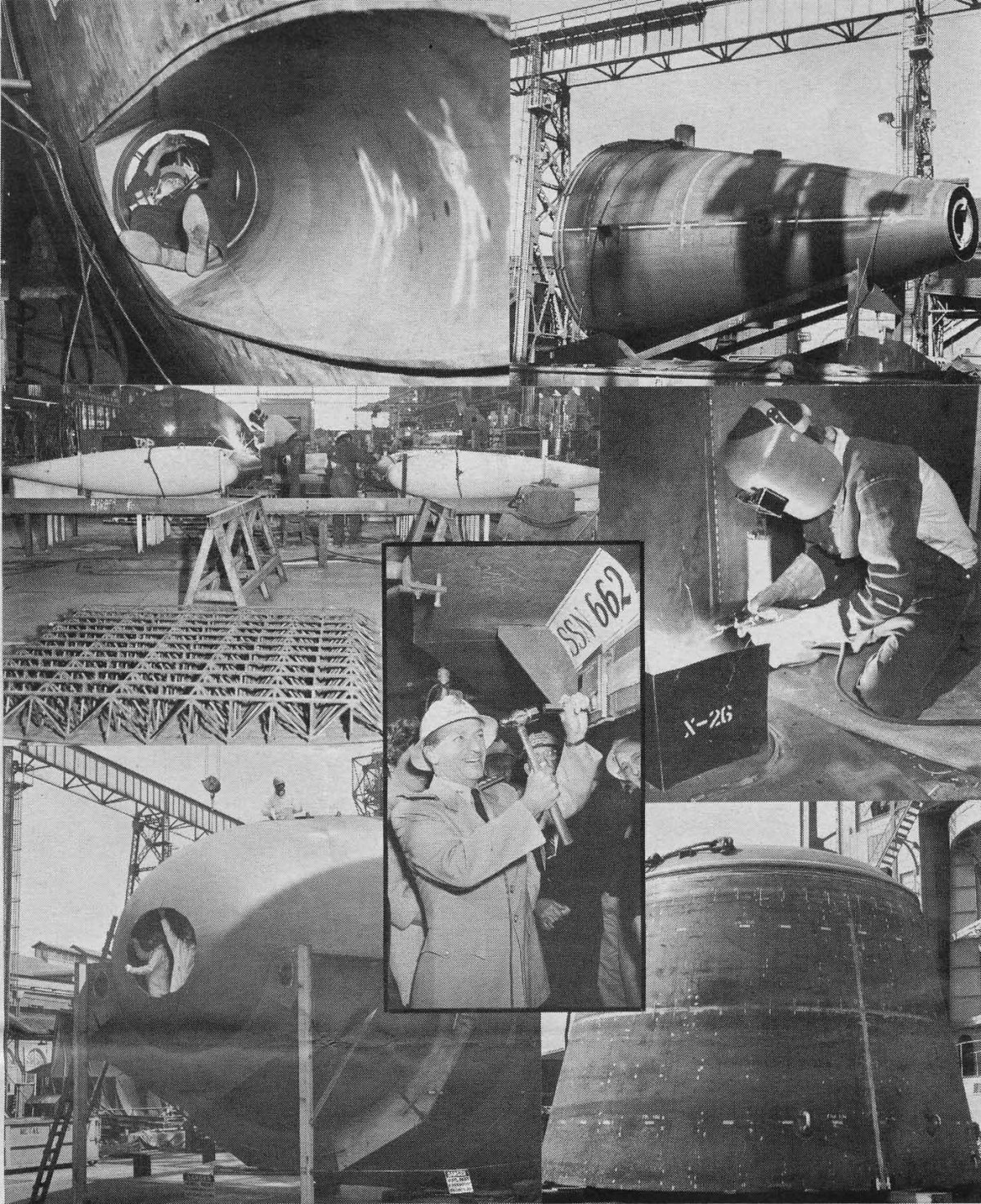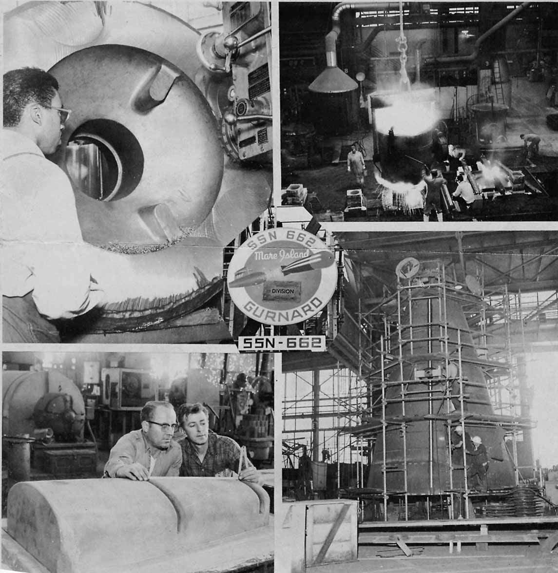 ![]() | 153k | This montage of the construction evolution for the Gurnard (SSN 662) at Mare Islands appeared in the 20 August 1965 issue of Mare Island's newspaper The Grapevine. Caption reads: "Upper Right picture of Gurnard's main seawater valve being poured in Shop 81 is first in point of time. Walt Sobotor is at the ladle as the 3000-degree batch of HY-80 steel is poured into the mold. Last week in Shop 31, Machine Operator Ted Randle has a similar value on his horizontal mill. Operation shown at upper left is facing of the valve body. Lower left picture shows Molders Ed Hasson (left) and George Allen, Jr., in Foundry making a final check of the core before the cope of the mold is lowered into place. What is seen is only one-third of the vertical stabilizer tip (four complete ones are needed on "the (662)"). Formerly shaped and welded, these are now cast-a cost reduction item. Below, right: stern section grows in Structural Shop. Welder (above) is Kenneth Hepler; Shipfitter Frank Palagi (below, right) is with Apprentice Ronald Smith, who is grinding. | USN photo courtesy of Darryl L. Baker. | |