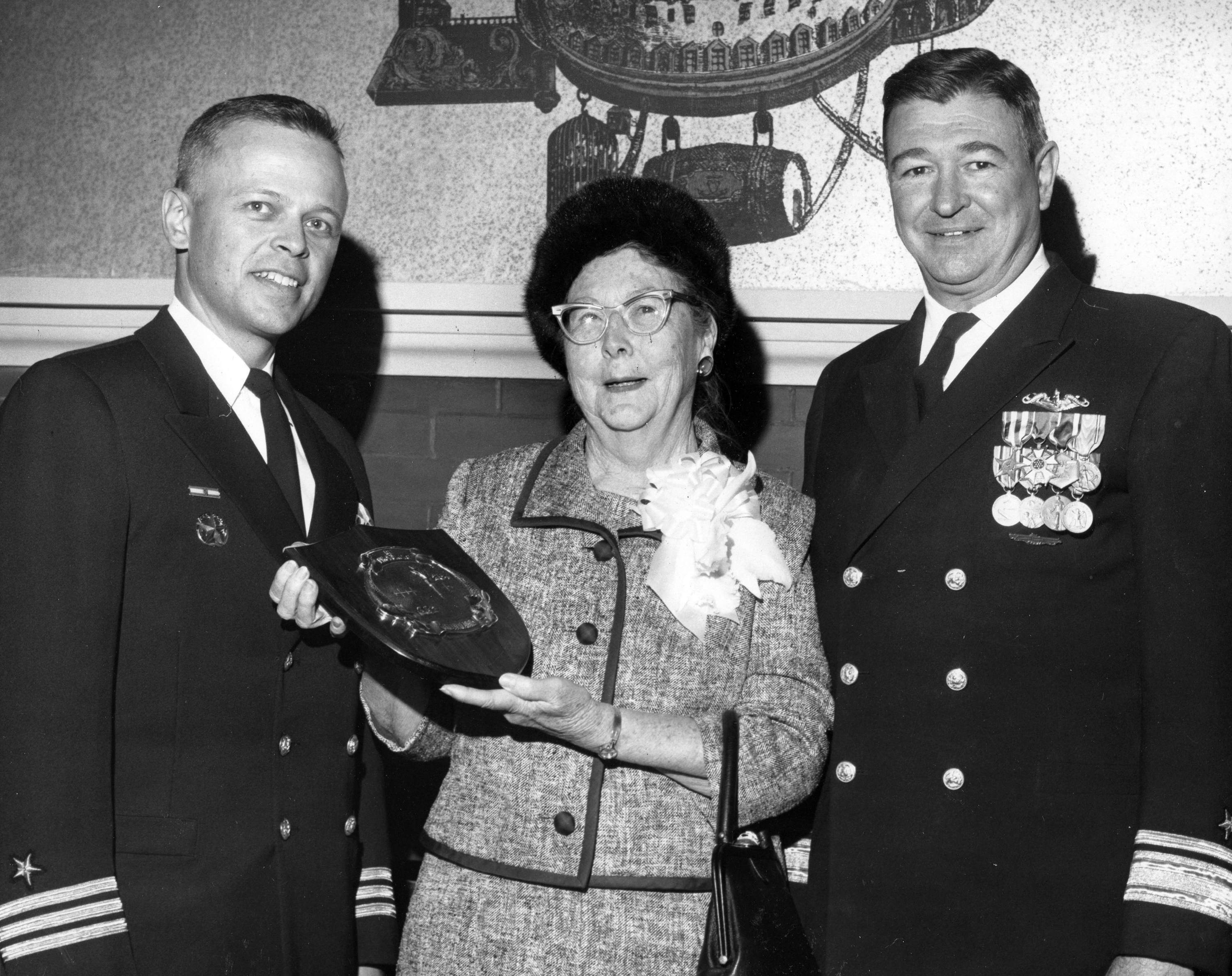 ![]() | 730k | Mrs. George P. Miller (Sponsor) is presented a ship plaque by CDR William Cole (Commanding Officer) after the commissioning of the Gurnard (SSN-662) at Mare Island on 6 December 1968. RADM Walter Lowry Small (COMSUBPAC) is to the right. | USN photo # 88182-12-68 TH, courtesy of the Vallejo Naval and Historical Museum via Darryl L. Baker. | |