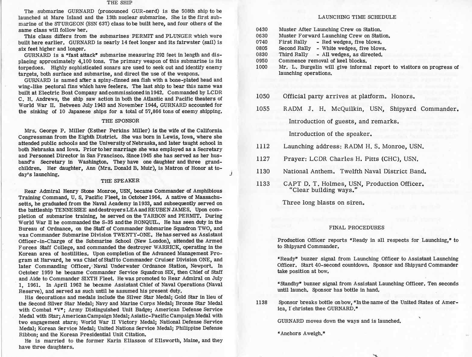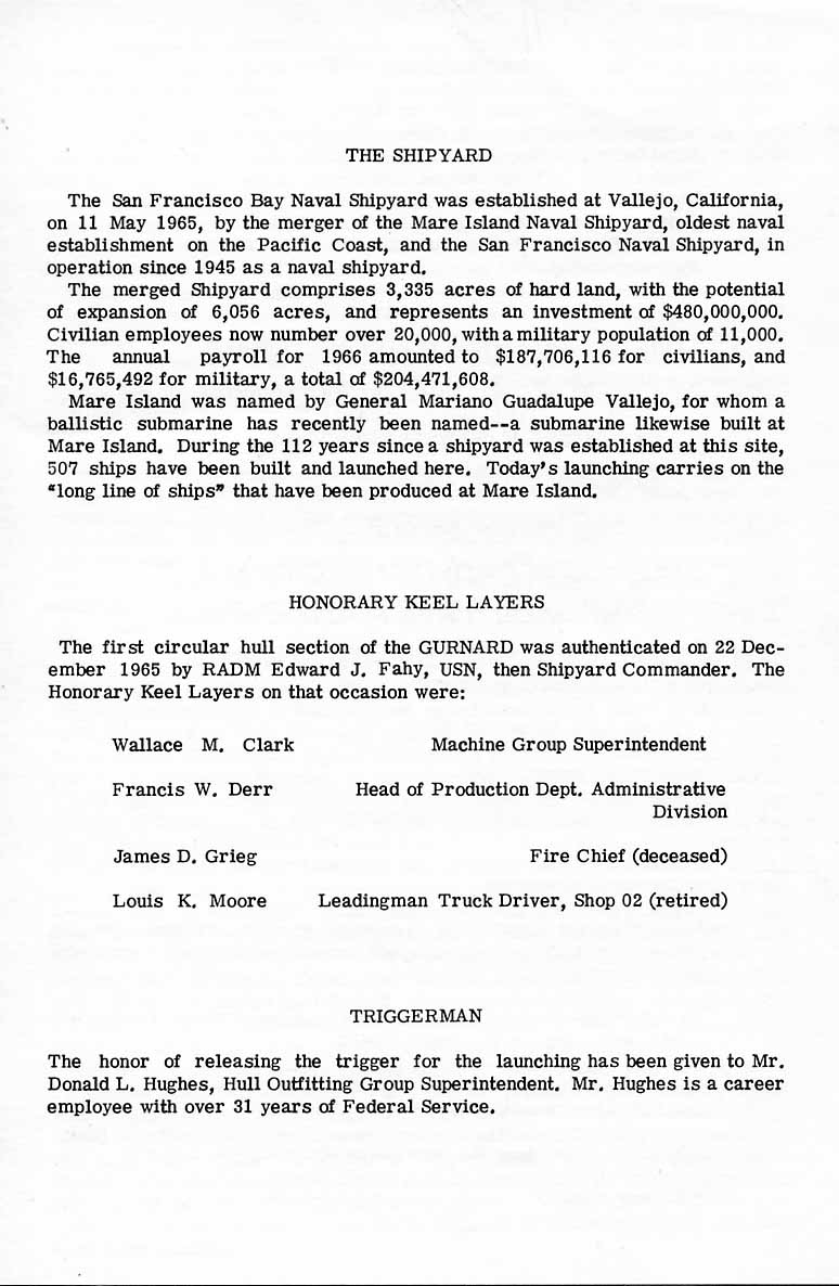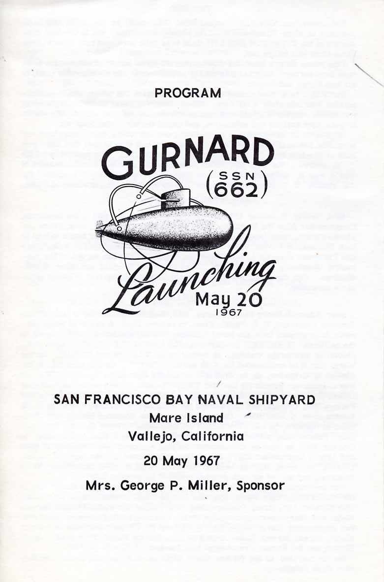 ![]() | 121k | Back cover of Launch Program for Gurnard (SSN-662). Cover includes a short history of Mare Island and names of the Honorary Keel Layers and launch Trigger-man. | USN photo courtesy of Darryl L. Baker. | |