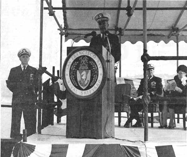 ![]() | 54k | News clipping from the 7 December 1968 edition of the Napa Register. Caption reads: RADM N. Frankenberger, center, Commander of Mare Island, makes opening remarks at the commissioning of the Gurnard (SSN-662) Friday morning at the shipyard. At left is CDR William S. Cole, Jr., Commanding Officer of the Gurnard. Seated are RADM Walter Lowry Small, COMSUBPAC and Mrs. George P. Miller, the ships' Sponsor. | Courtesy of Darryl L. Baker. | |