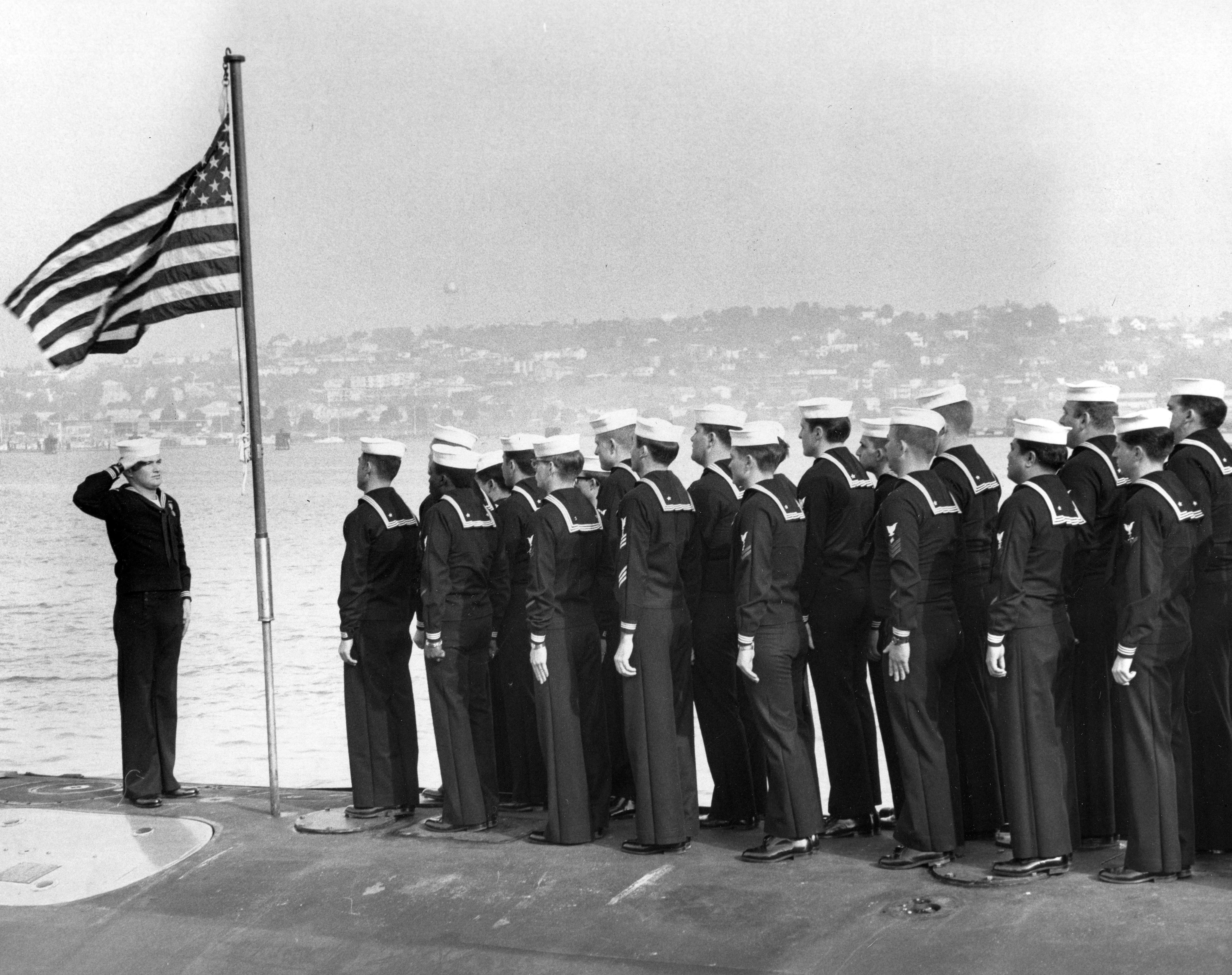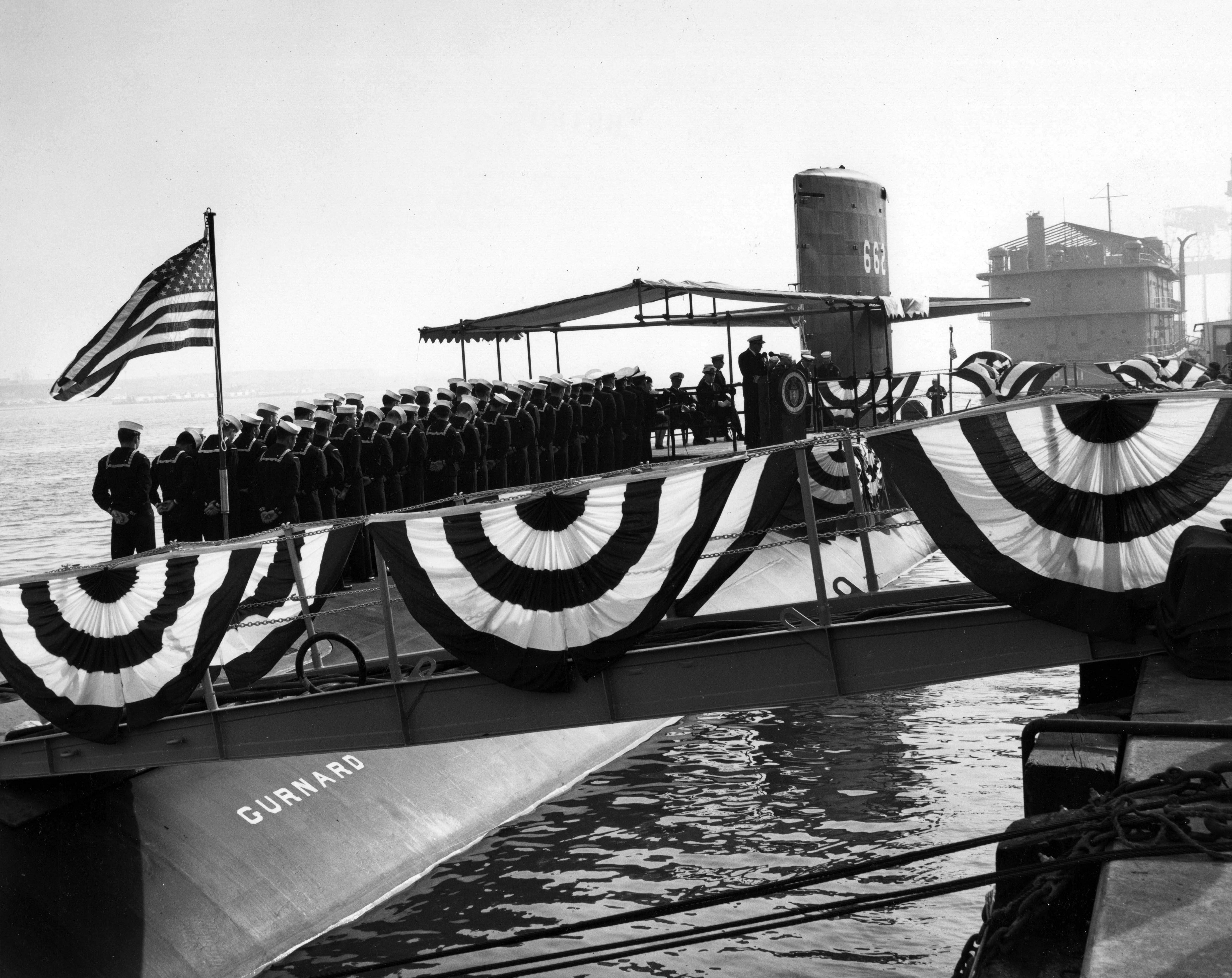![]() | 1.40k | Rippling wind blows during the commissioning ceremonies aboard the Gurnard (SSN-662) on 6 December 1968. | USN photo # 88180-12-68, contributed by Darryl L. Baker. | |