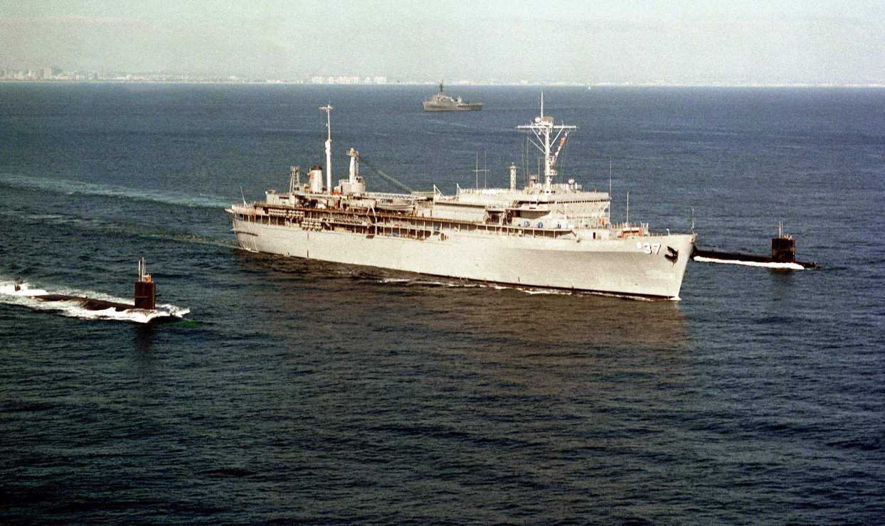 ![]() | 124k | The submarine tender Dixon (AS-37) departs San Diego 17 September 1990 with the nuclear-powered attack submarines Guitarro, left, and Gurnard (SSN-662). The ships will be taking part in Exercise FallEx '90. | Official USN photo # DN-SC-91-04869, by PH 2 Patrick W. Muscatt, from the Department of Defense Still Media Collection, courtesy of dodmedia.osd.mil. & submitted by Bill Gonyo. | |