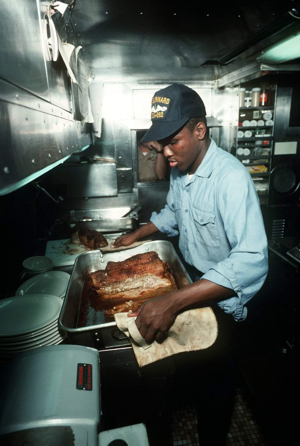![]() | 115k | On board the nuclear-powered attack submarine Gurnard (SSN-662); submariners are rumored to eat the best in the world during deployments when they are submerged for long periods of time. Here a food services person readies rolled rump roast, which indicates they eat pretty well when tied up in port also. | Official USN photo # DN-ST-97-00581, by PHC Bob Sasek, from the Department of Defense Still Media Collection, courtesy of dodmedia.osd.mil. & submitted by Bill Gonyo. | |