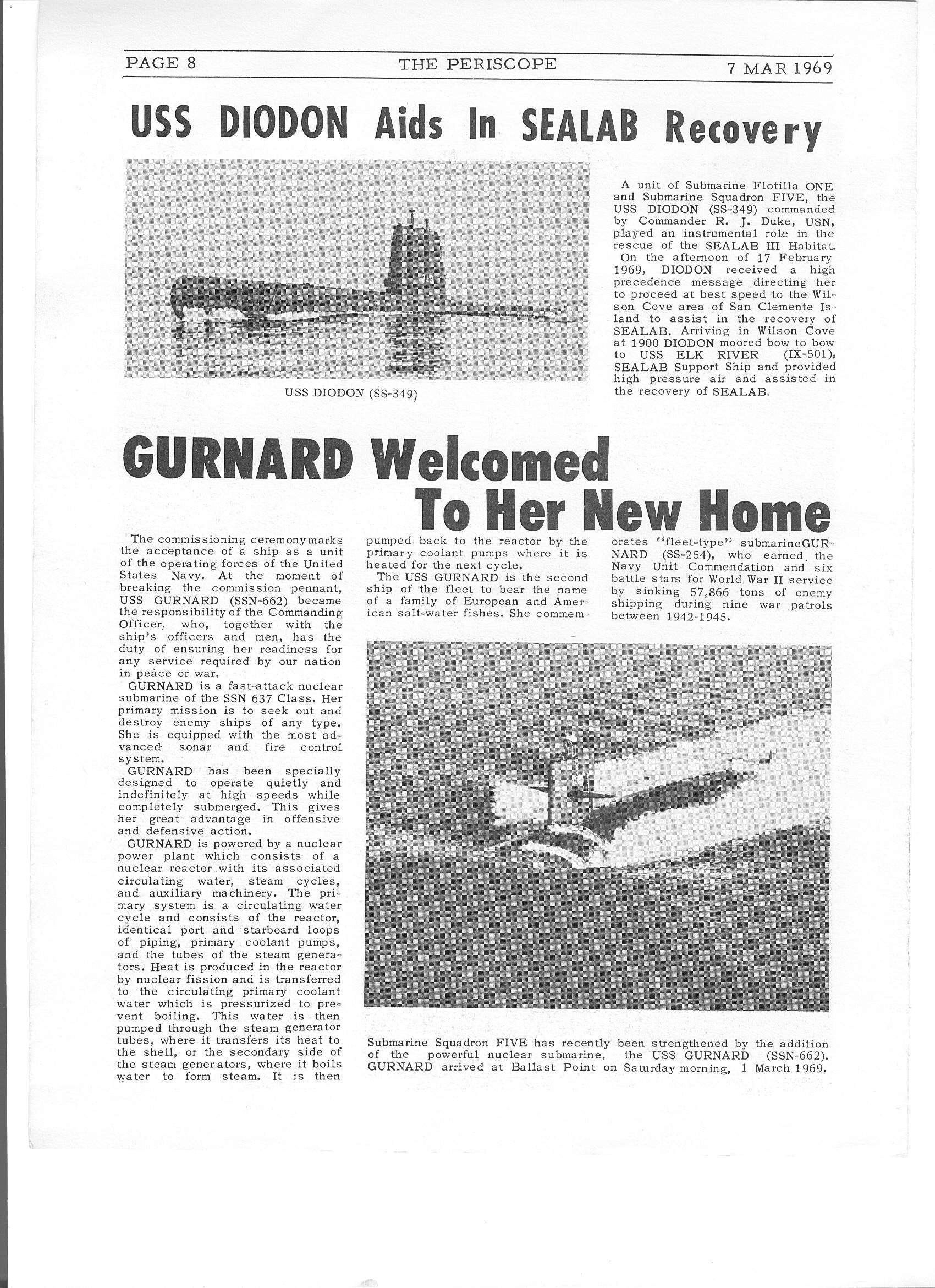 ![]() | 621k | Newspaper article from The Periscope", the station newspaper of Naval Submarine Base, San Diego on the arrival of the Gurnard (SSN-662), 1 March 1969. | Photo courtesy of David Buell. | |