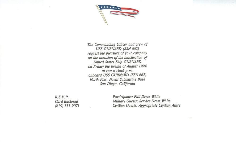 ![]() | 31k | Inactivation Ceremony invitation for the Gurnard (SSN-662) on 12 August 1994. | Photo courtesy of David Buell. | |