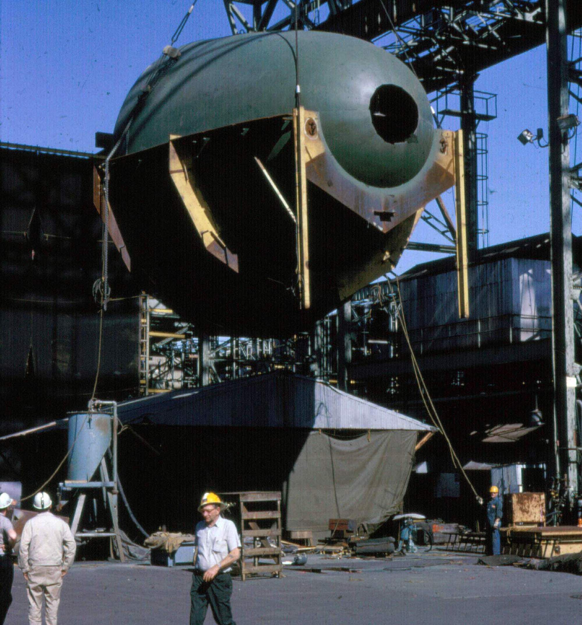 ![]() | 402k | Sonar dome for the Gurnard (SSN-662) being lowered into place on the building ways at Mare Island on 16 May 1966. | USN photo courtesy of Darryl L. Baker. | |