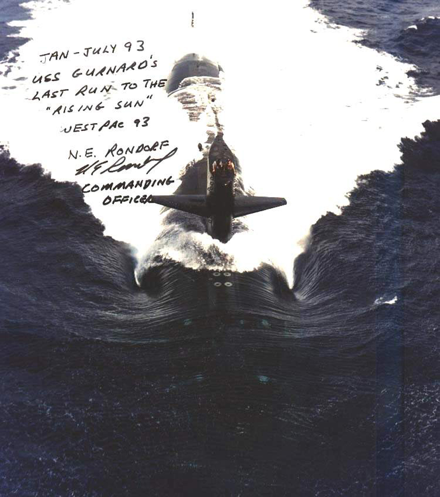 ![]() | 431k | January - July 1993 would find the Gurnard (SSN-662) on her "last run to the rising sun". | Photo courtesy of Scott Koen & ussnewyork.com | |