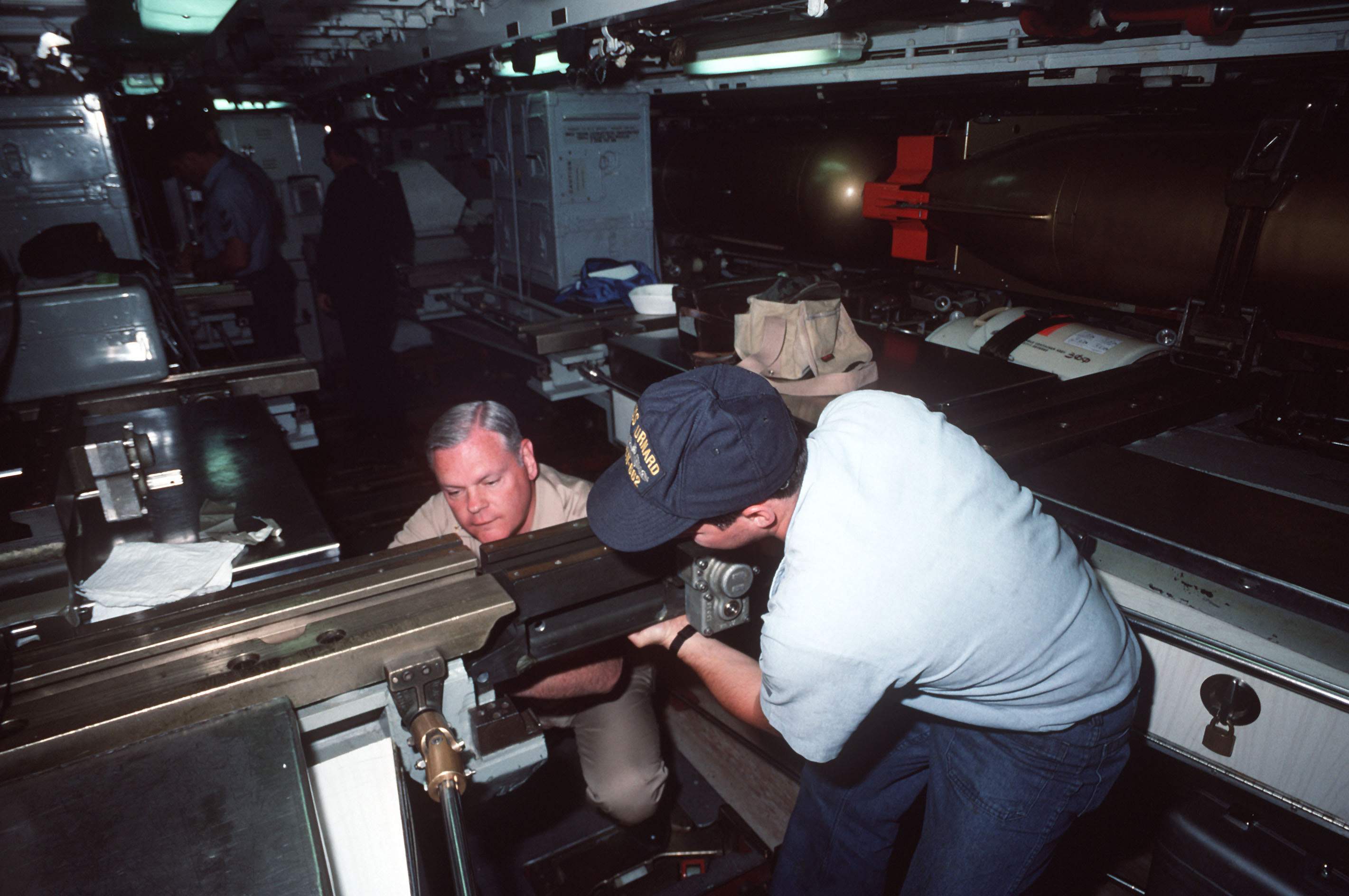 ![]() | 351k | A chief petty officer supervises a fellow crewman in the torpedo room of the nuclear-powered Gurnard (SSN-662) as they make adjustments to the torpedo transport rails at San Diego Harbor on 1/1/1991. | USN photo # DN-ST-97-00580 by PHC Bob Sasek courtesy of defenseimagery.mil. | |