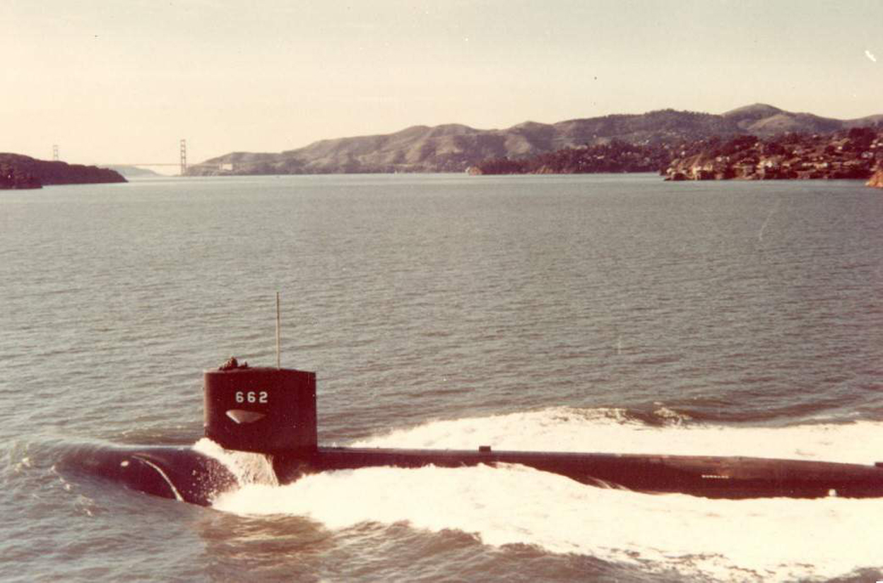 ![]() | 95k | Bow on view of the Gurnard (SSN-662) passing underneath the Golden Gate Bridge, possibly during her sea-trials, 1967-68. | Official USN photo courtesy of Wendell Royce McLaughlin Jr. | |