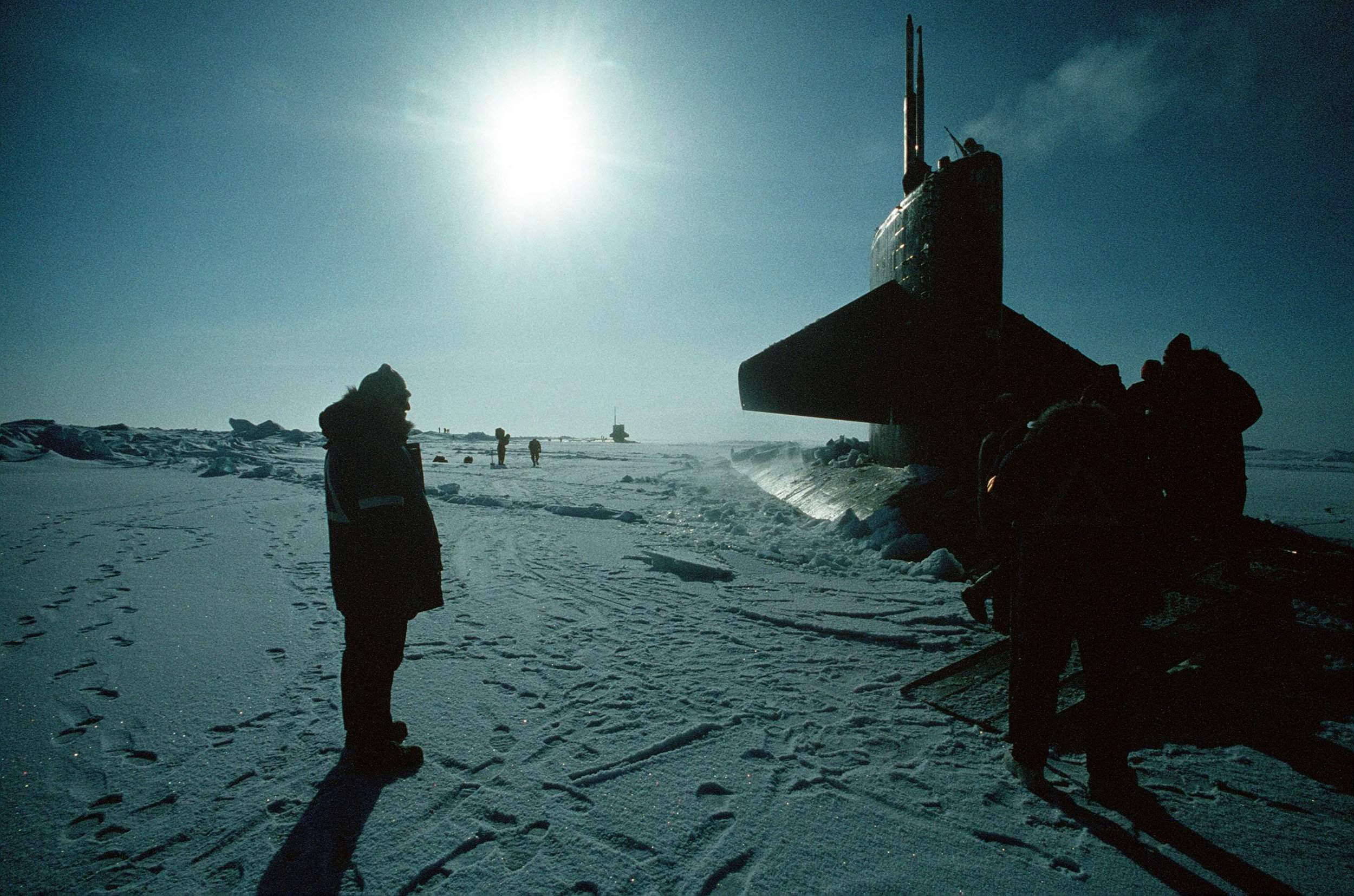 346k | Crew members stand on the bow of the nuclear-powered attack submarine Gurnard (SSN-662), background, as others gather nearby to watch the nuclear-powered attack submarine Seahorse (SSN-669) surface through the ice during exercise Ice Ex '90, 25 March 1990. | USN photo # DN-ST-90-08033, by PH1 Harry Gerwien, from the Department of Defense Still Media Collection, courtesy of dodmedia.osd.mil. | |