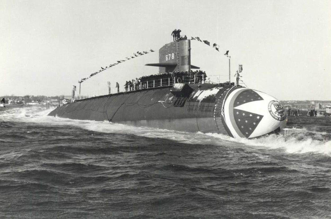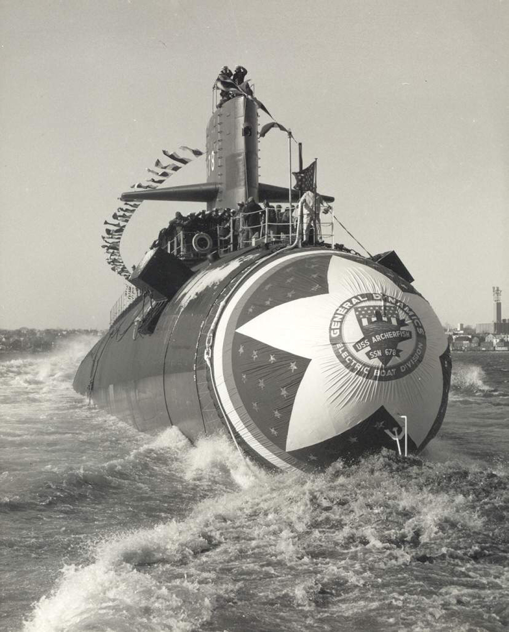 ![]() | 489k | Archerfish (SSN-678) slides stern first from the launching ways on into the Thames River at the Electric Boat Div., General Dynamics Corp., Groton, CT., 16 January 1971. | USN photo # NPC 1147466 courtesy of Scott Koen & ussnewyork.com | |