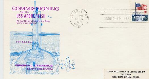 ![]() | 21k | Commemorative post card marking the commissioning of the Archerfish (SSN-678), 17 December 1971. | Courtesy of Richard Leonhardt. | |