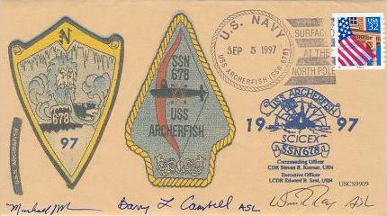 ![]() | 47k | Commemorative post card marking the occasion of the Archerfish (SSN-678) breaking through the Arctic ice cap, 5 September 1997. | Courtesy of Jack Treutle (of blessed memory). | |