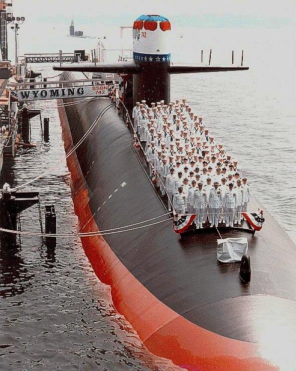 ![]() | 153k | Wyoming (SSBN-742) commissioning ceremony, at the Electric Boat Division of General Dynamics Corp., Groton, CT., 13 July 1996. Note in the background the Archerfish (SSN-678) heading to the Mediterranean Sea for a six month deployment. The Archerfish was home ported out of Groton and would work with Seal Team 2 deploying them from the DDS. | Photo & text i.d. courtesy of