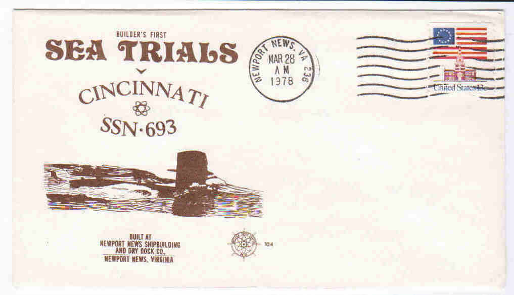 ![]() | 37k | Commemorative postal cover issued on the occasion of the first builders trials of the Cincinnati (SSN-693), 28 March 1978. | Courtesy of Jack Treutle (of blessed memory). | |