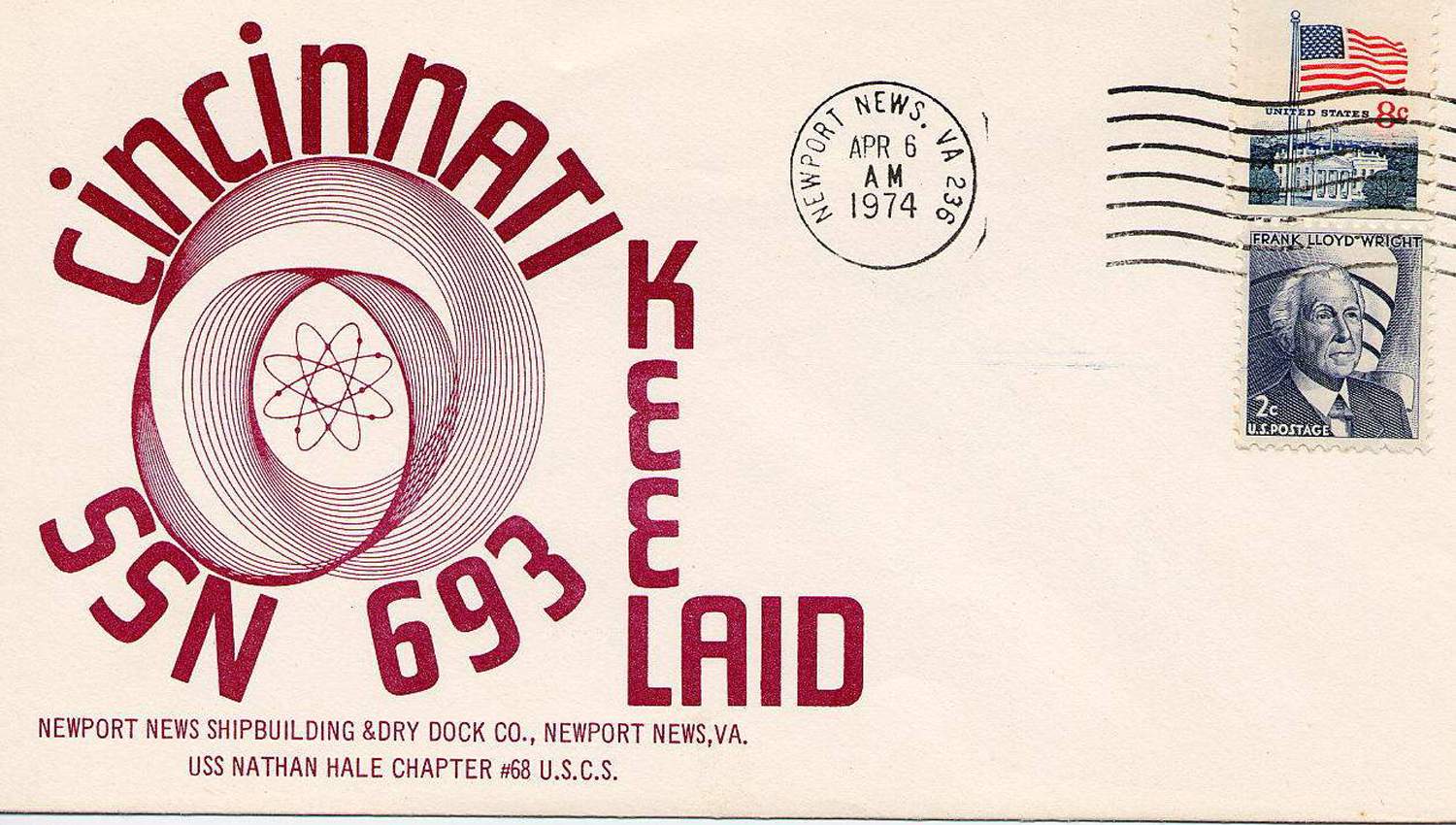 ![]() | 206k | Commemorative postal cover issued on the occasion of the keel laying of the Cincinnati (SSN-693), 6 April 1974 at Newport News Shipbuilding and Drydock Co., Newport News, VA. | Photo courtesy of Scott Koen & ussnewyork.com. | |