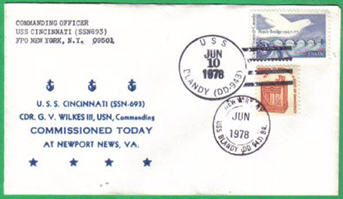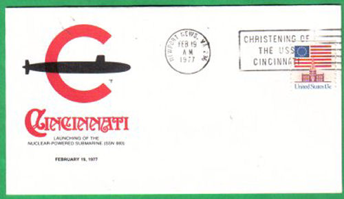 ![]() | 29k | Commemorative postal cover issued on the occasion of the Cincinnati's (SSN-693) commissioning, 10 June 1978. | Courtesy of Jack Treutle (of blessed memory). | |