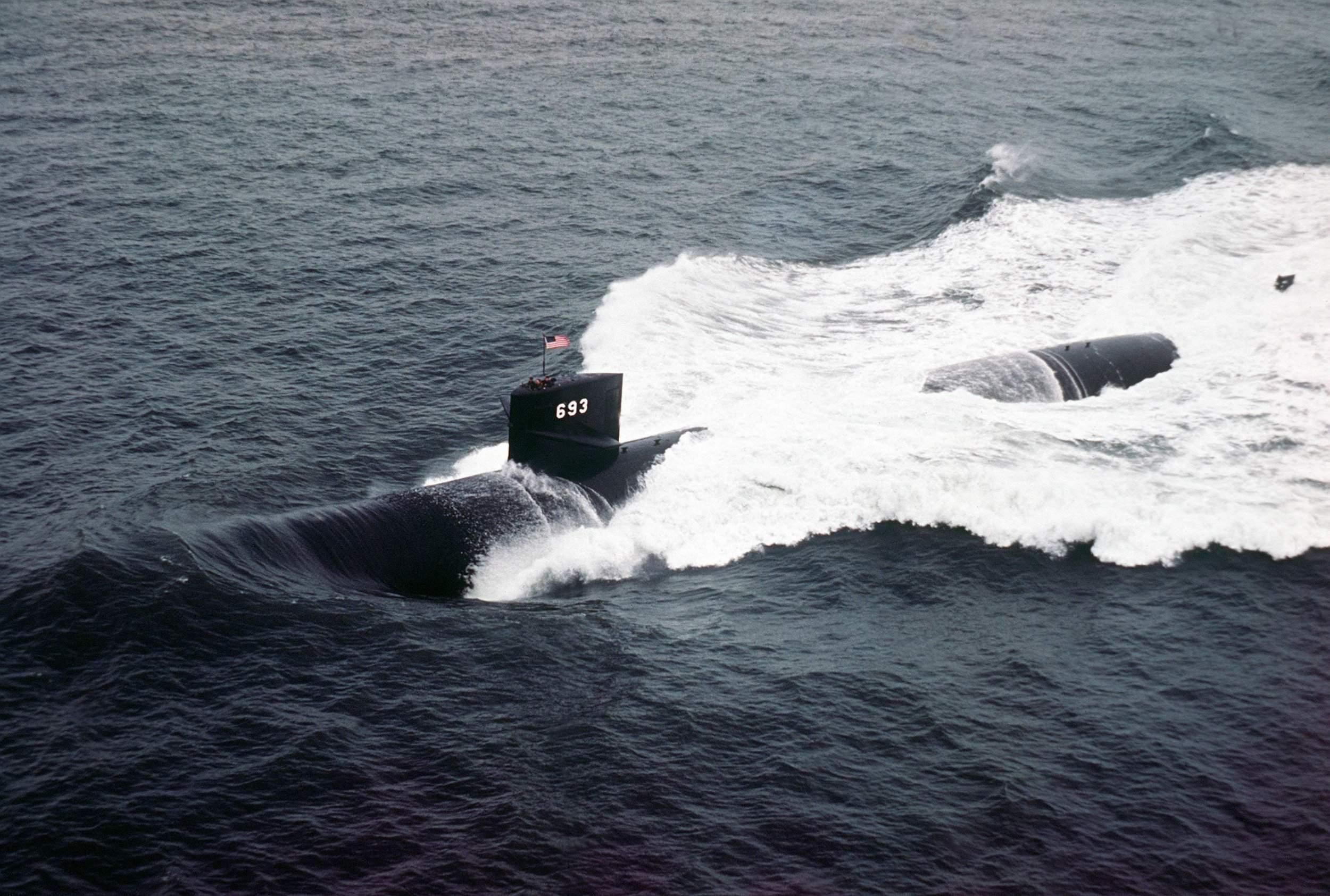 ![]() | 453k | A port view of the nuclear-powered attack submarine Cincinnati (SSN-693) underway on 1 January 1978. | USN photo # DN-ST-82-04890, by Newport News & Shipbuilding, from the Department of Defense Still Media Collection, courtesy of dodmedia.osd.mil. | |