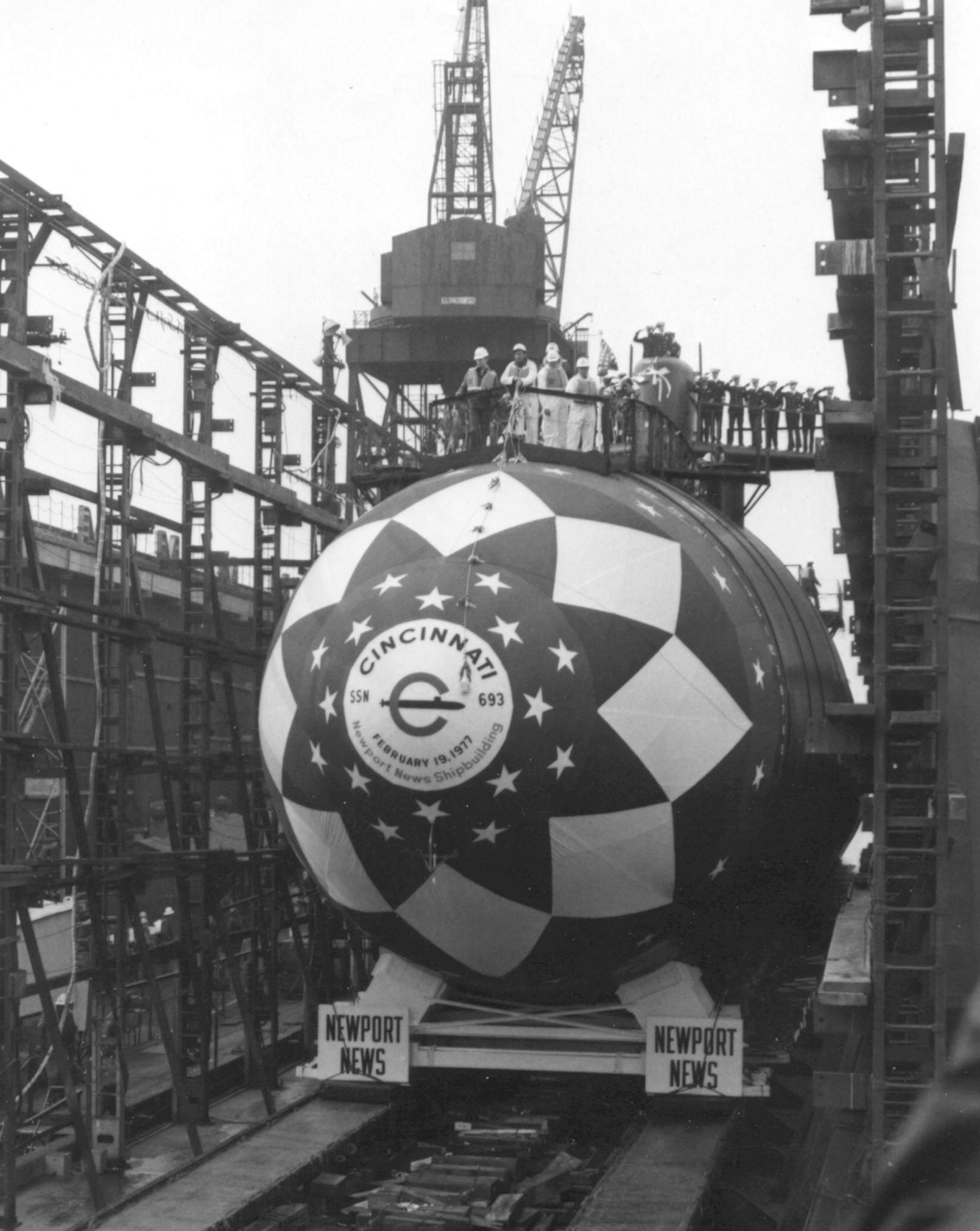 ![]() | 327k | Keel laying of the Cincinnati (SSN-693), 6 April 1974 at Newport News Shipbuilding and Drydock Co., Newport News, VA. | Photo courtesy The Daily Press, June, 1977 via Dale Hargrave. | |