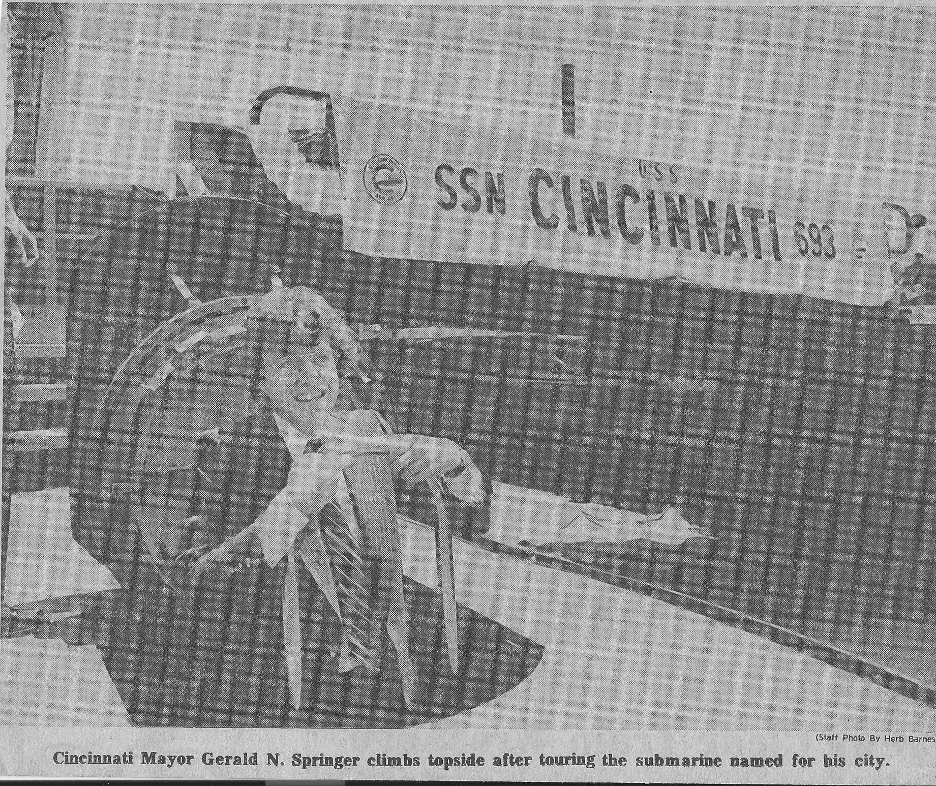 ![]() | 984k | Mayor Gerald Springer of Cincinnati (yes, THAT Jerry Springer) aboard Cincinnati (SSN-693) prior to commissioning. | Photo courtesy The Daily Press, June, 1977 via Dale Hargrave. | |