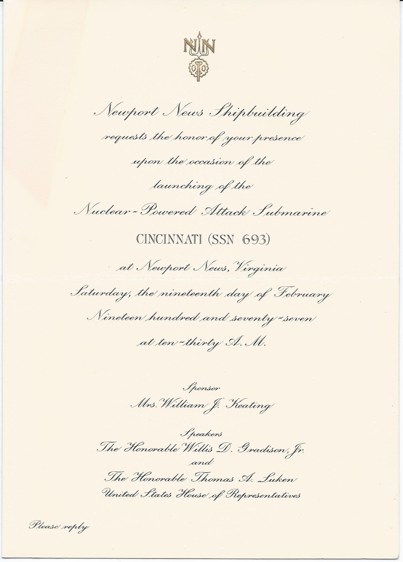 ![]() | 168k | Invitation for the launching of the Cincinnati (SSN-693), 19 February 1977 at Newport News Shipbuilding and Drydock Co., Newport News, VA. | Photo courtesy of Dale Hargrave. | |