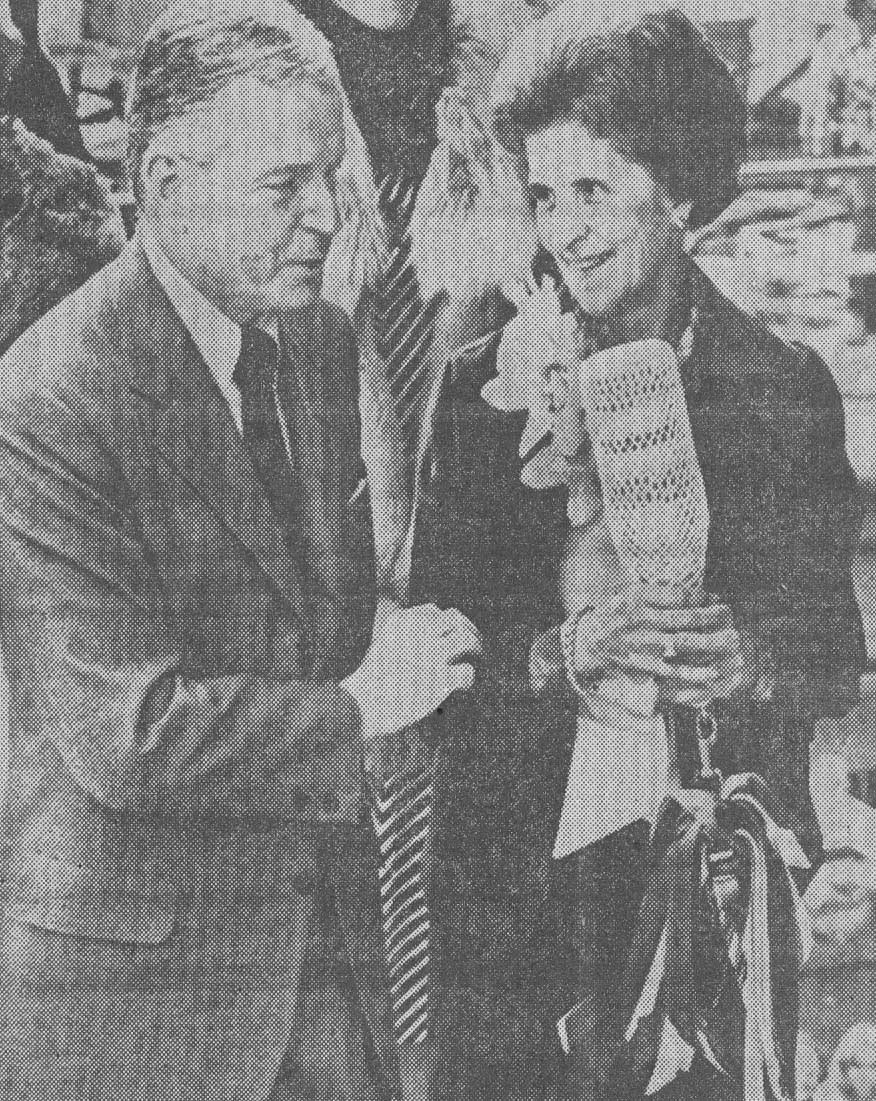 321k | Newspaper photo: With Mrs. Keating as she prepared to christen Cincinnati (SSN-693) is Ralph Cousins, then president of Newport News Shipbuilding. | Photo courtesy of Dale Hargrave. | |