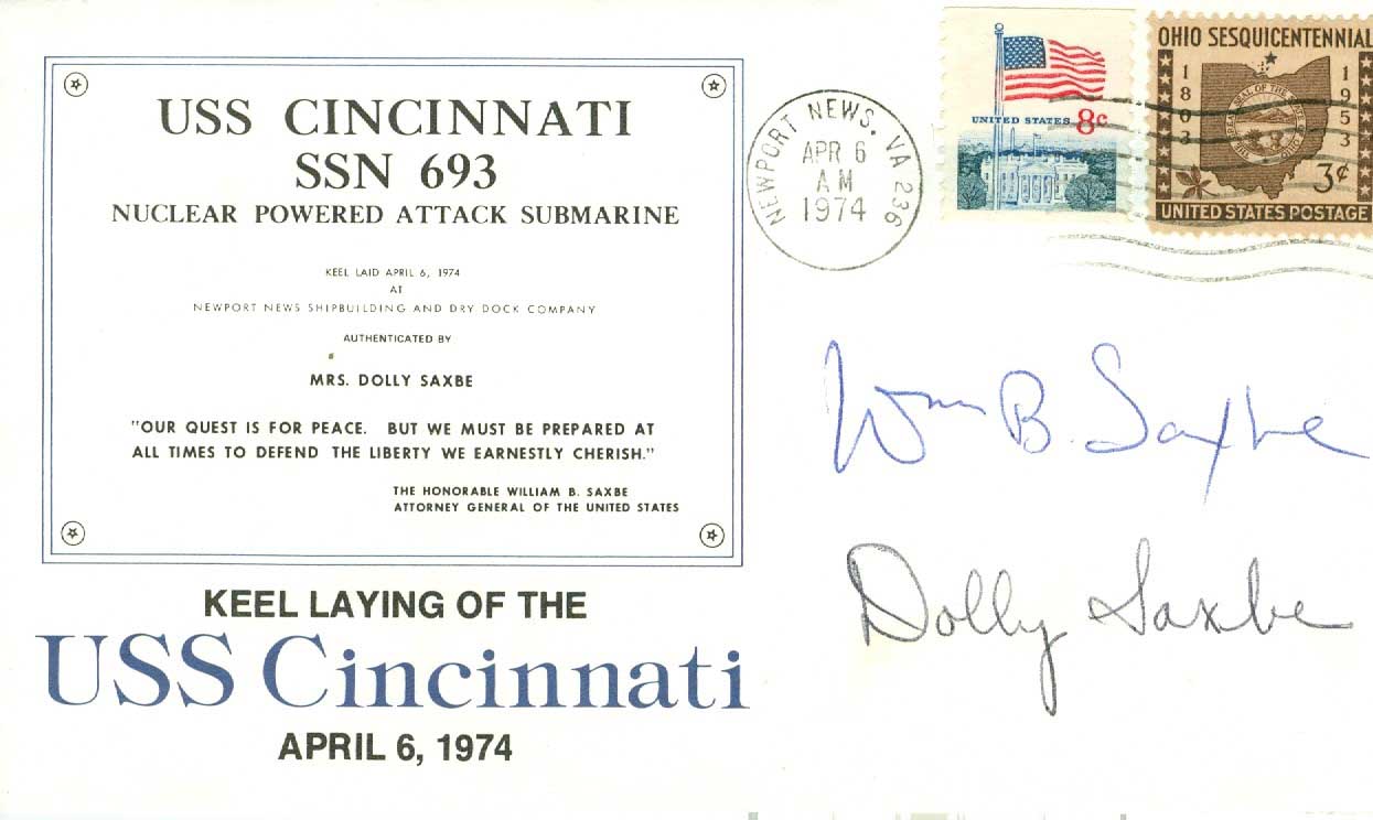 107k | Postal cover from the keel laying signed by Senator William Saxbe of Ohio, the speaker, and his wife Dolly, the authenticator. | Photo courtesy of Dale Hargrave. | |