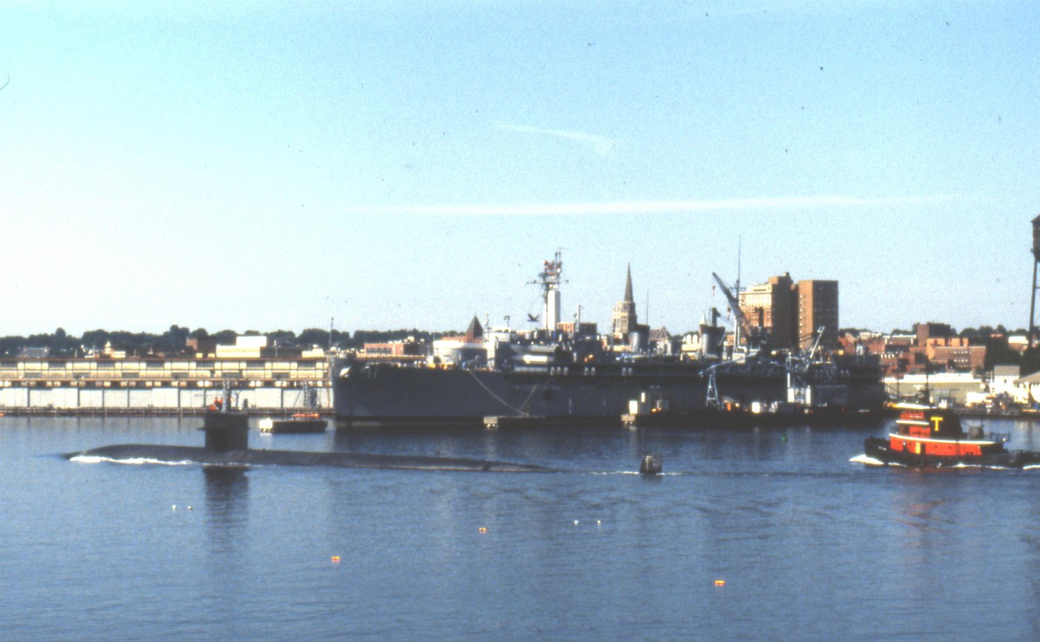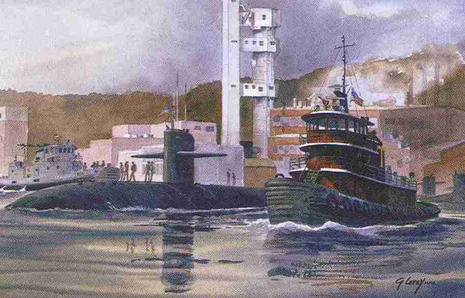 84k | Groton (SSN-694) arriving at New London, passing Electric Boat yard and Rhode Island (SSBN-740) fitting out in early 1993. | Photo by Ken Hart. | |