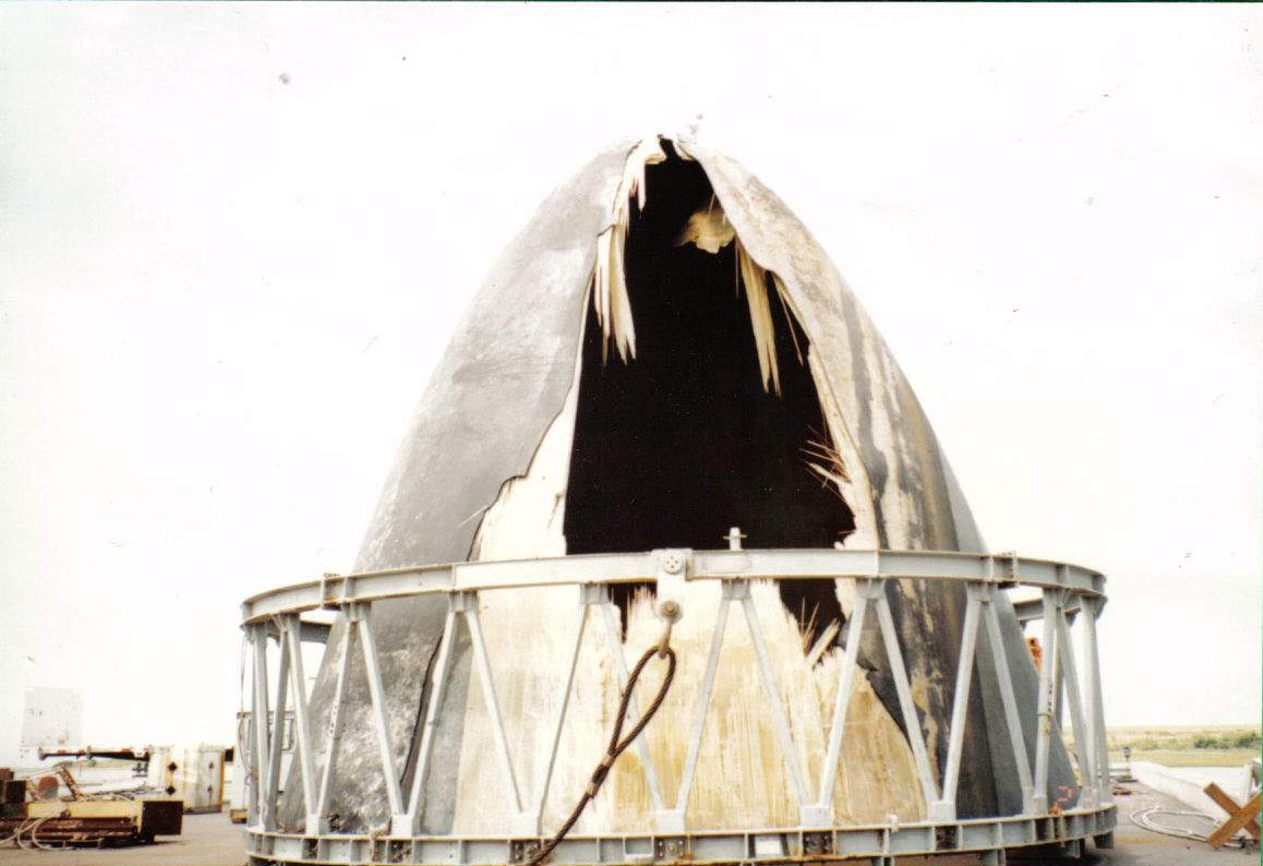 91k | Cracked sonar dome of the Groton (SSN-694) after returning to Kings Bay, GA, 23 July 1996. The rupture was caused by an air pocket that did not fully vent upon submerging. | Courtesy of Jack Treutle (of blessed memory). Photo i.d. courtesy of Kenneth Reed, EDMC Ret. | |
